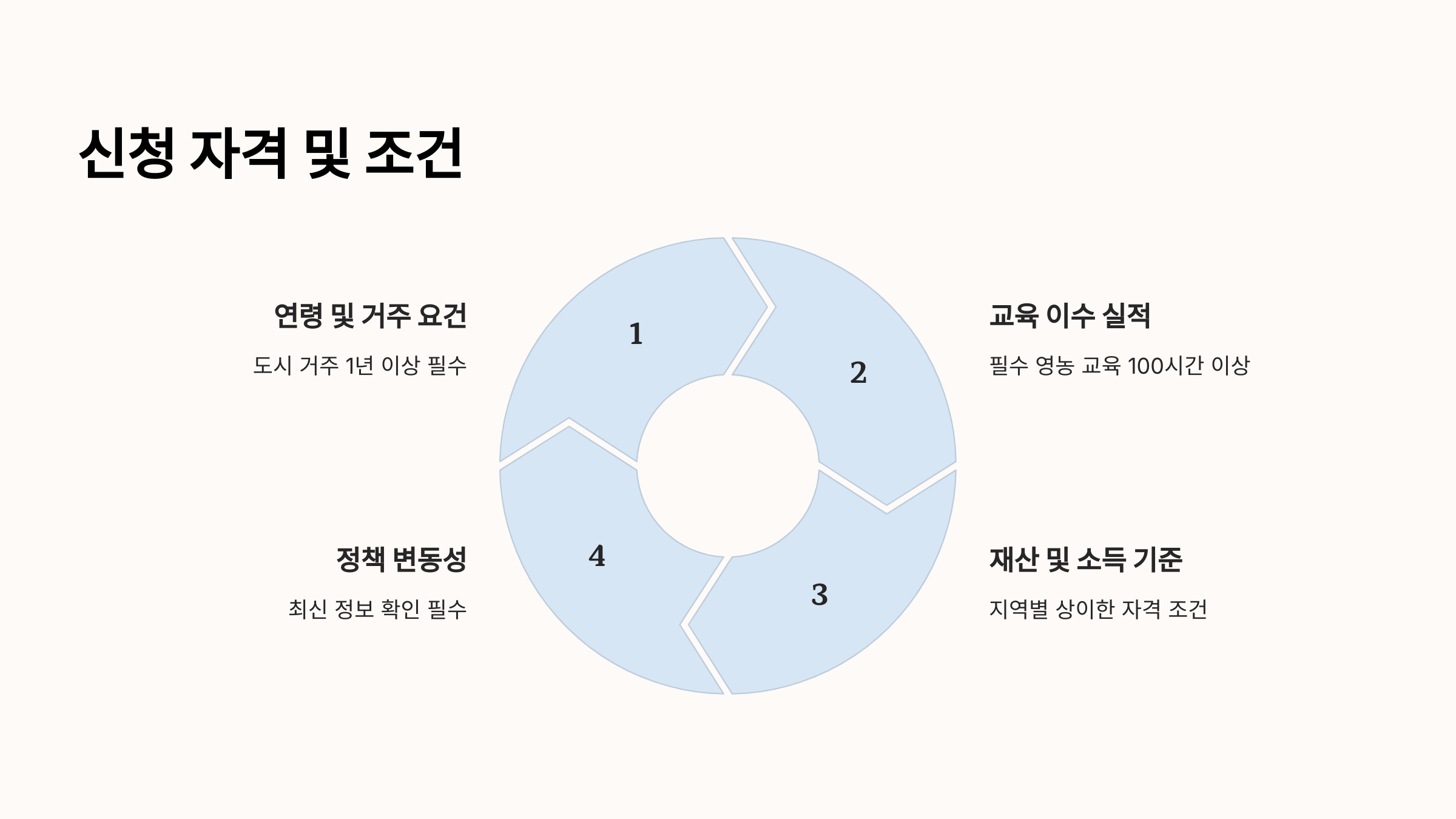 교육 이수: 귀농 교육 100시간 이상 이수(온라인+오프라인 포함).