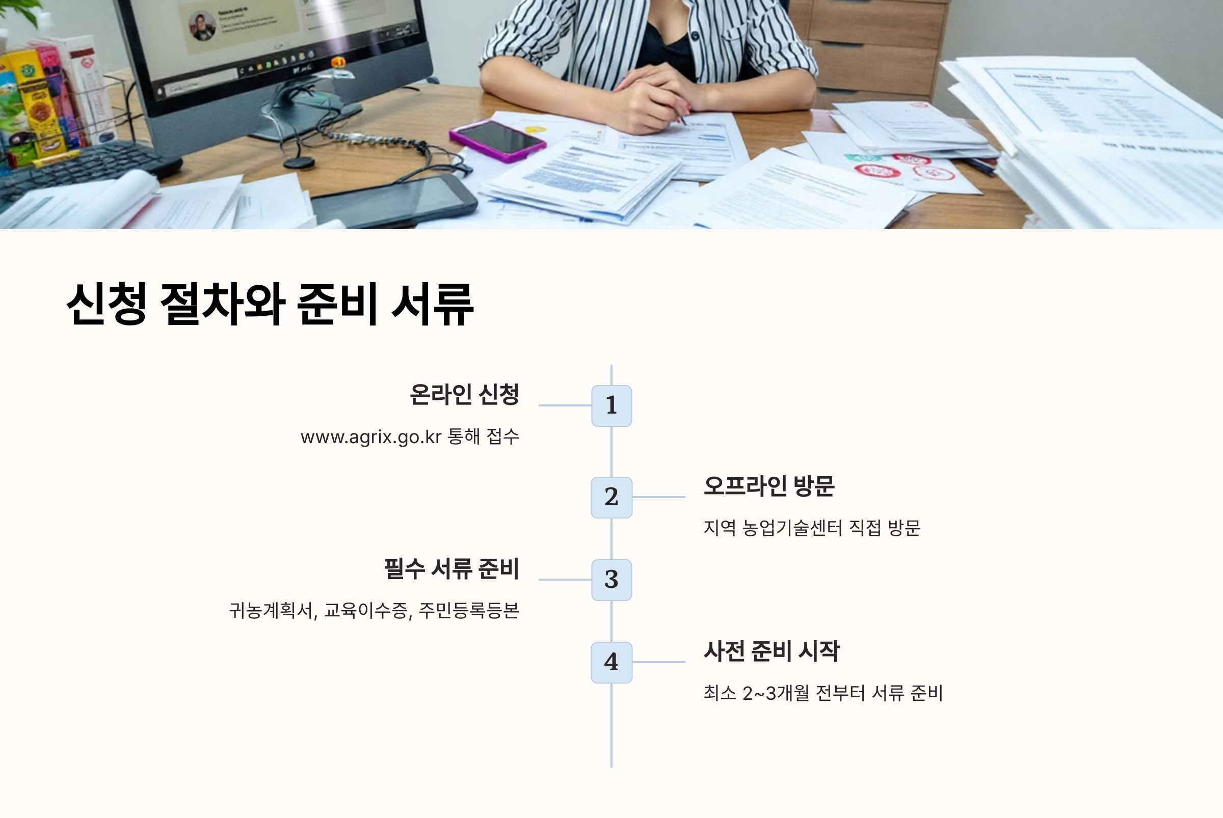 교육 이수: 귀농 교육 100시간 이상 이수(온라인+오프라인 포함).