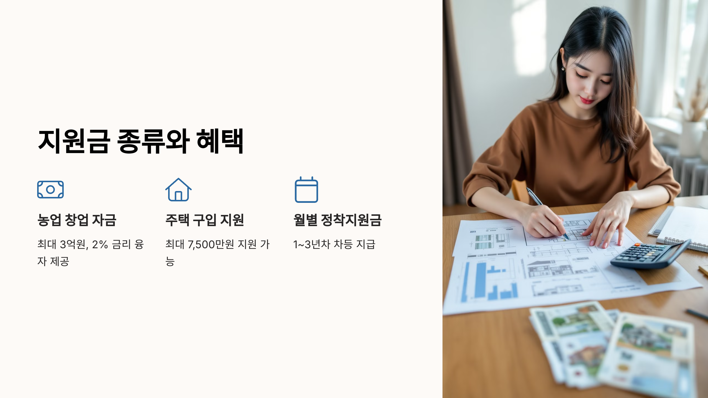 특히 청년층은 영농정착지원금으로 월 최대 100만 원을 3년간 받을 수도 있어요. 저는 이건 자격이 안 맞아서 못 받았지만, 조건 맞는 분들은 꼭 챙기세요!