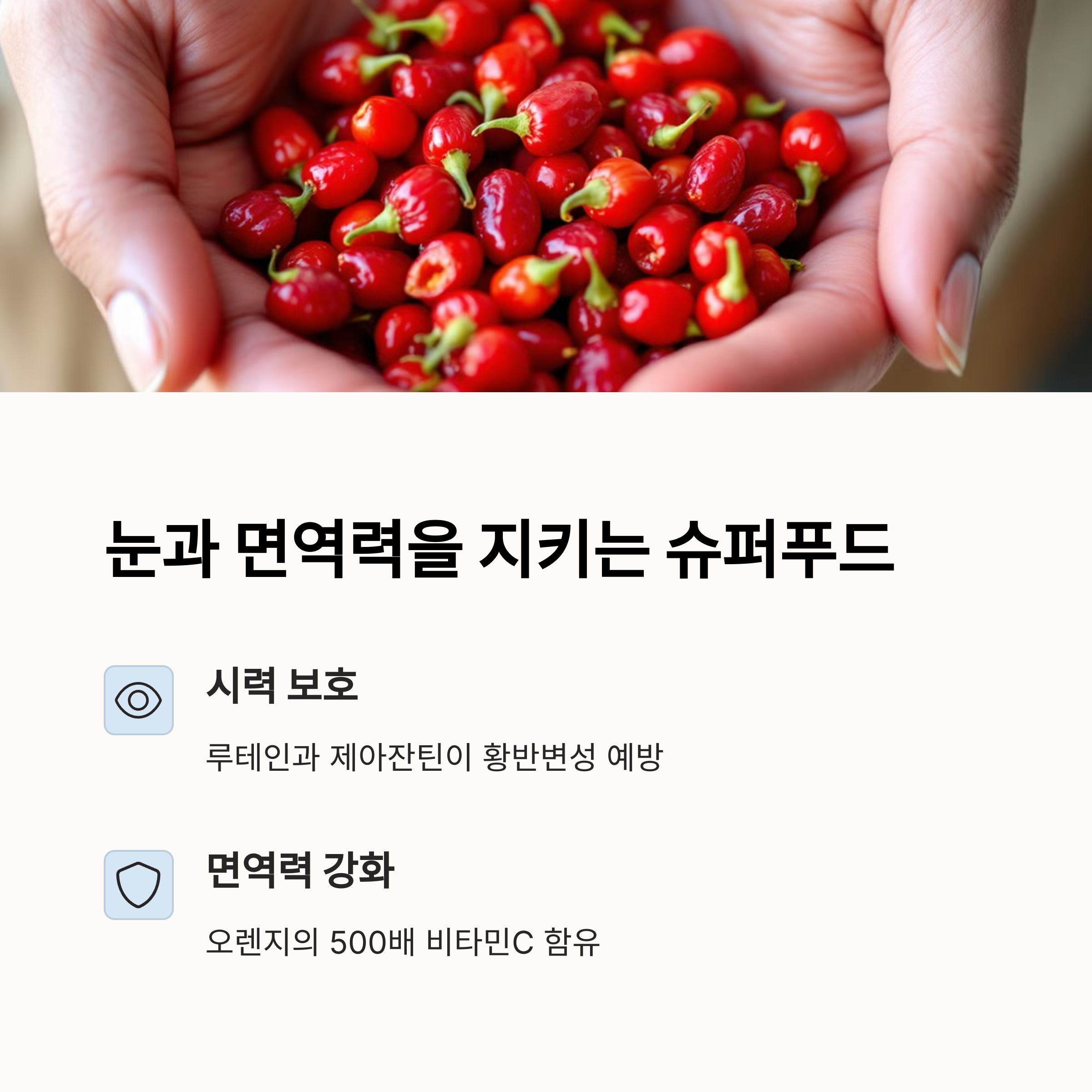 현대인의 눈 건강을 위한 구기자는 제아잔틴(zeaxanthin)과 루테인(lutein)이 풍부해 망막을 보호하고 황반변성이나 백내장을 예방해요. 2024년 미국 안과학회 연구에서 구기자를 3개월 섭취한 50대 이상 그룹은 시력 저하 속도가 15% 느려졌다고 해요.