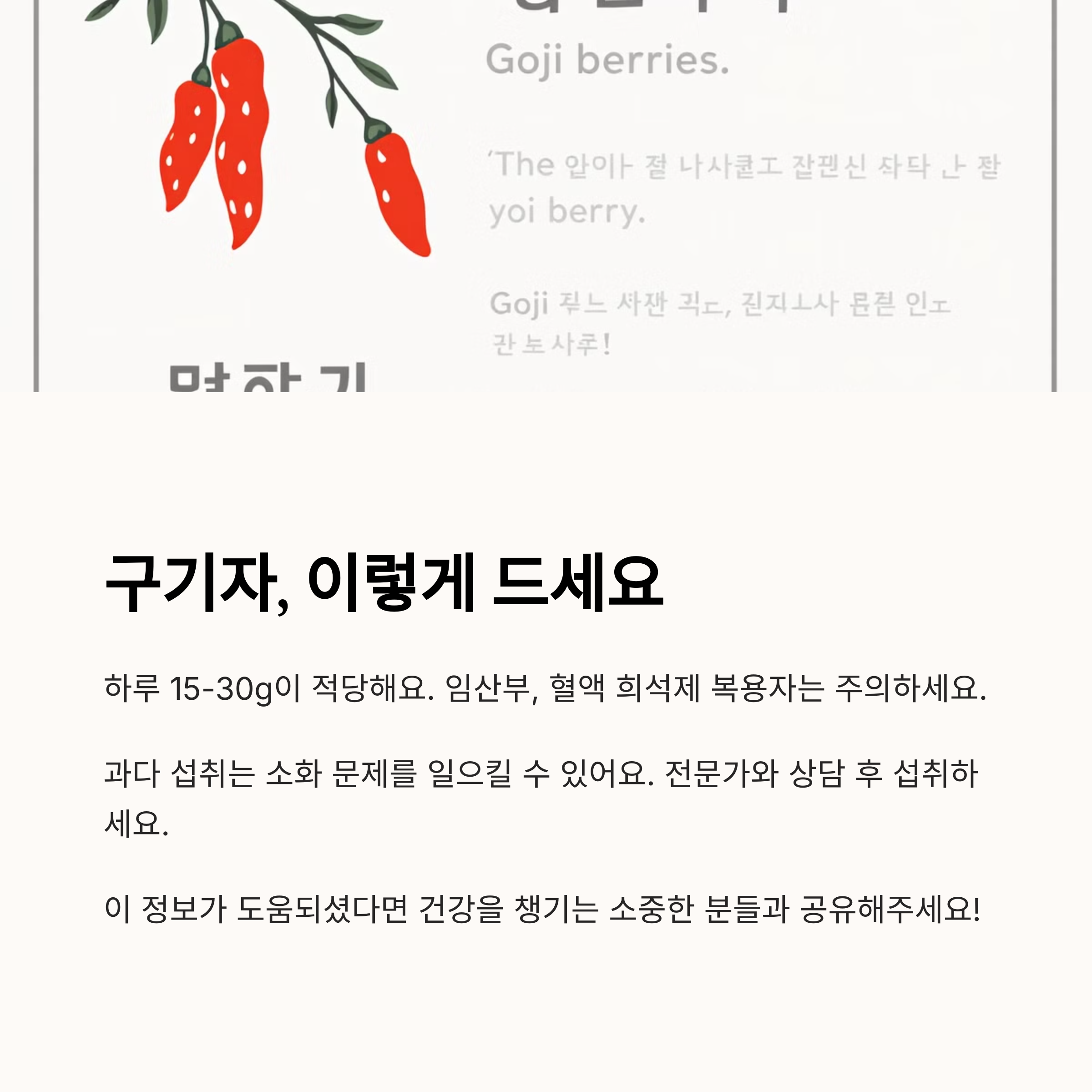 알레르기 반응: 드물지만 구기자에 알레르기가 있는 사람은 피부 발진이나 가려움증을 느낄 수 있어요. 처음 먹을 땐 적은 양으로 테스트해보세요.