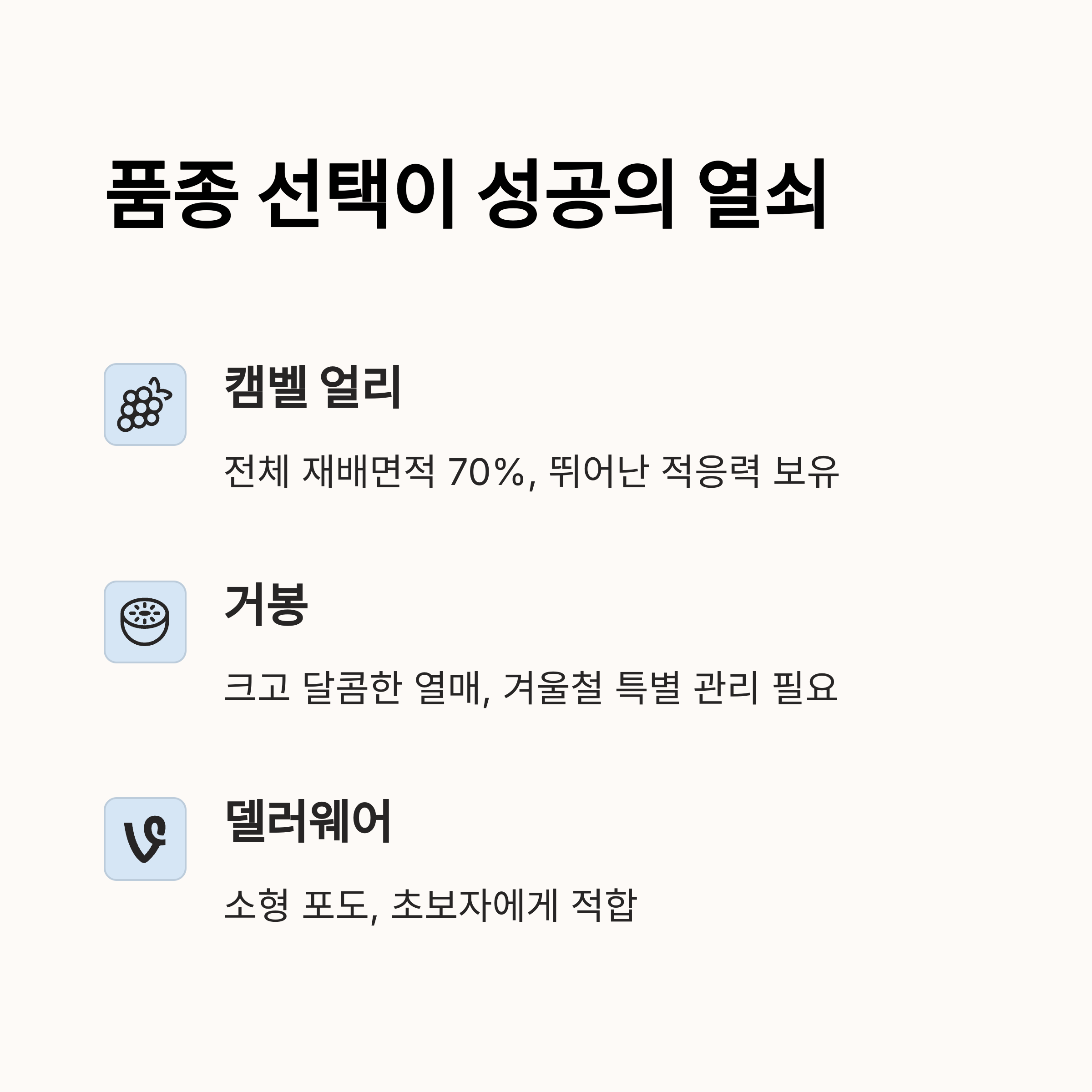 캠벨얼리는 전체 재배 면적의 약 70%를 차지할 정도로 사랑받는 품종인데, 그 이유는 적응력이 뛰어나고 맛이 좋아서예요. 반면 거봉은 큰 열매와 달콤함으로 유명하지만, 내한성이 약해 겨울철 관리가 조금 더 필요하죠.