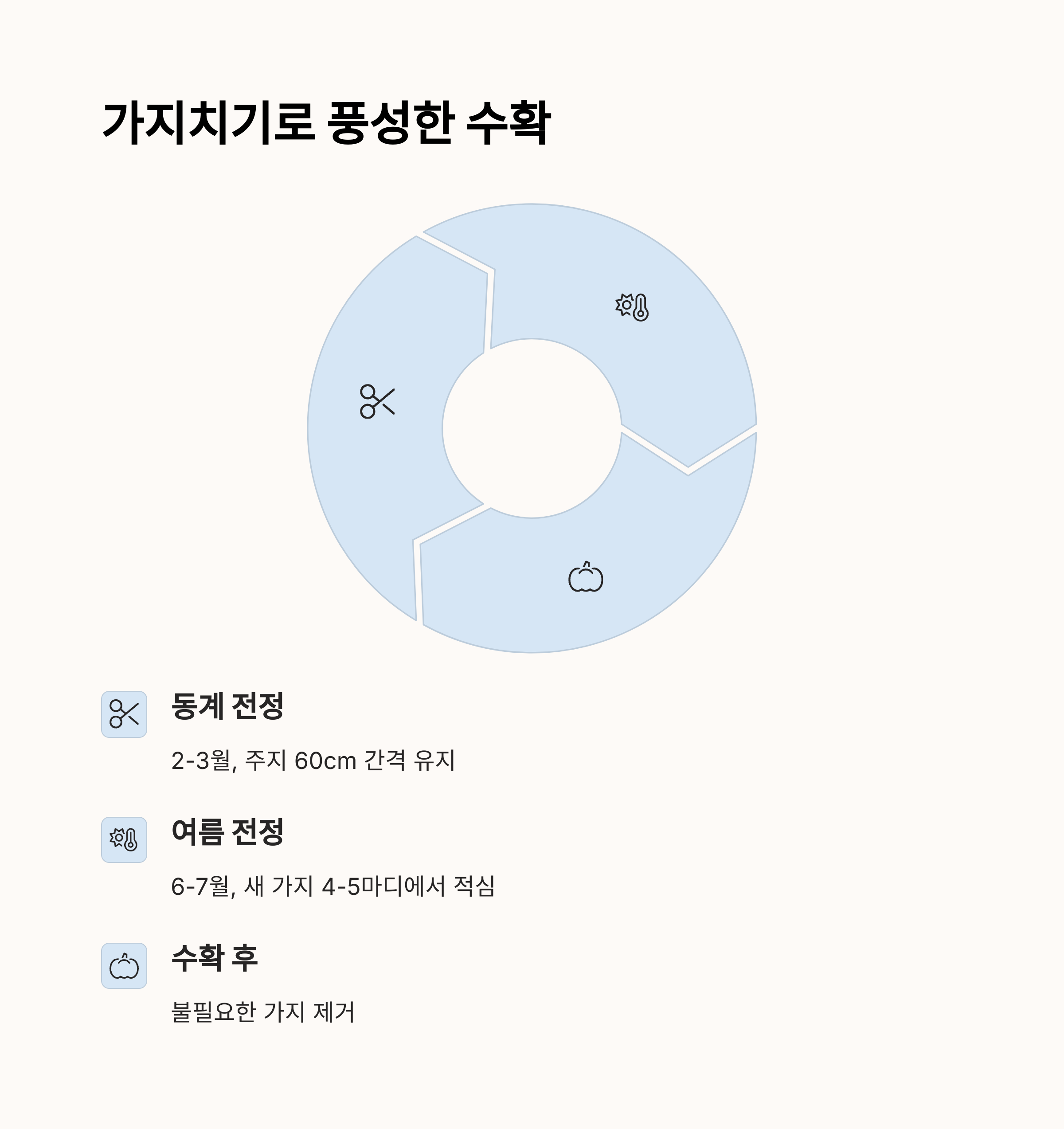 방법: 주줄기 외에 과도하게 자라는 순을 잘라내세요. 열매 주변 잎은 8~10장만 남기고 정리하면 햇빛과 통풍이 좋아져요.