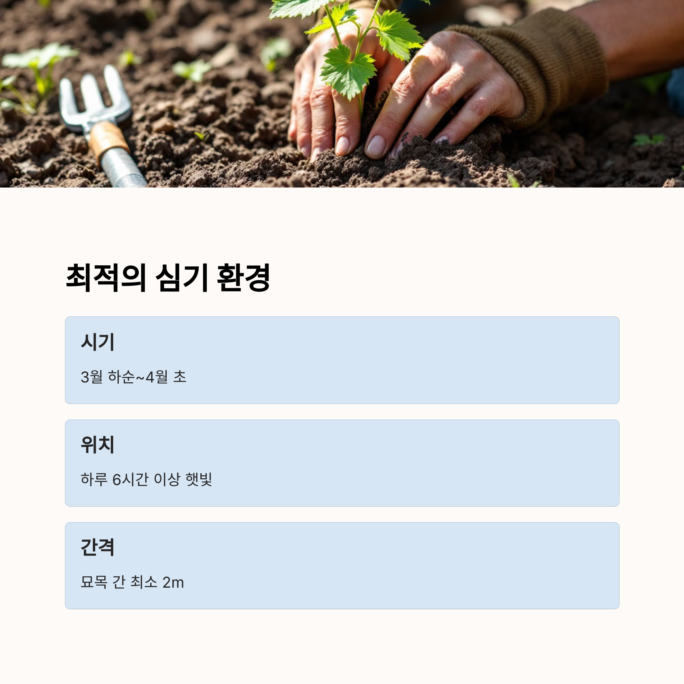 묘목을 골랐다면 이제 심는 법을 알아볼게요. 포도나무는 처음 심을 때 잘 자리 잡아야 나중에 튼튼하게 자라요.