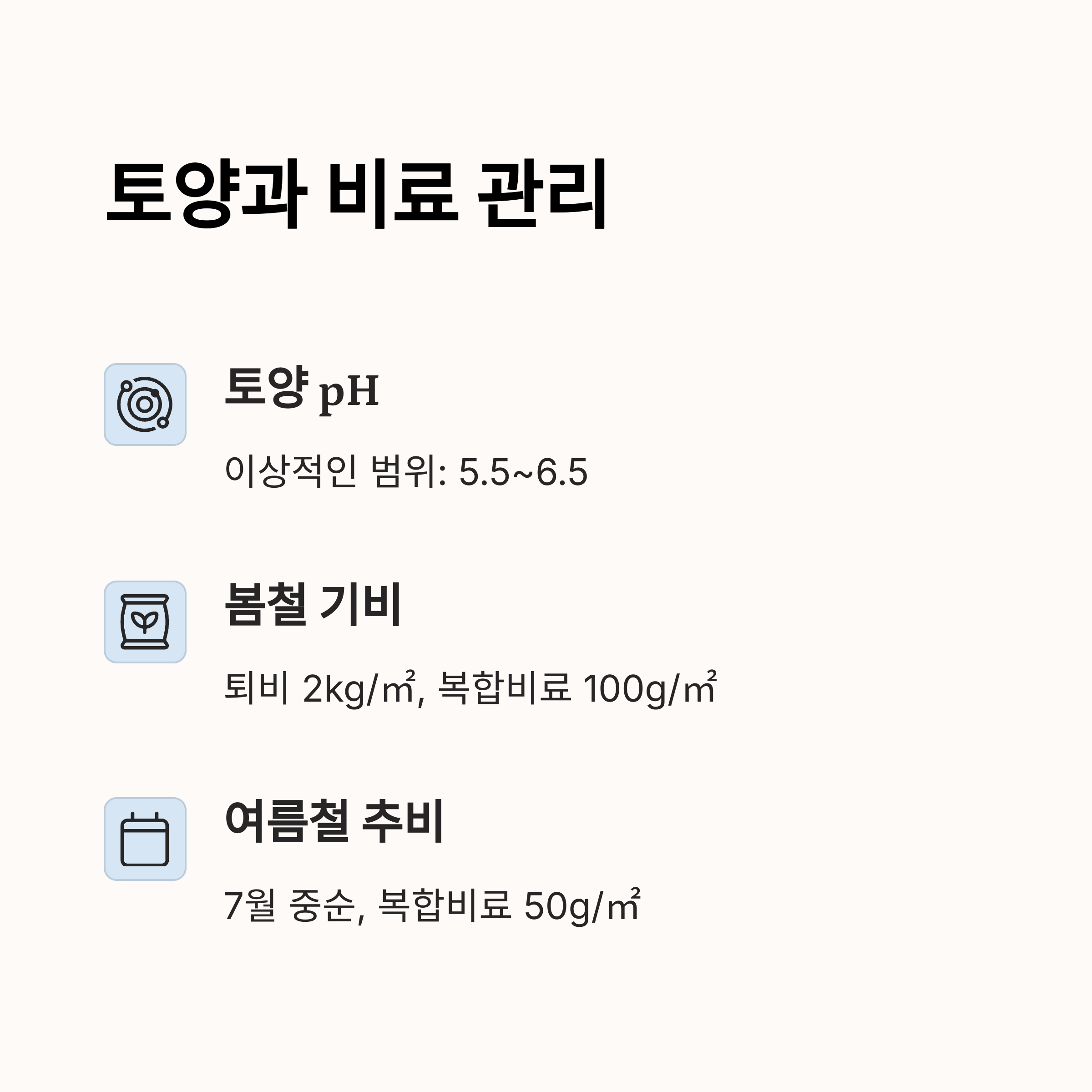 밑거름: 심기 전 퇴비나 유기질 비료를 1㎡당 2~3kg 넣어요.