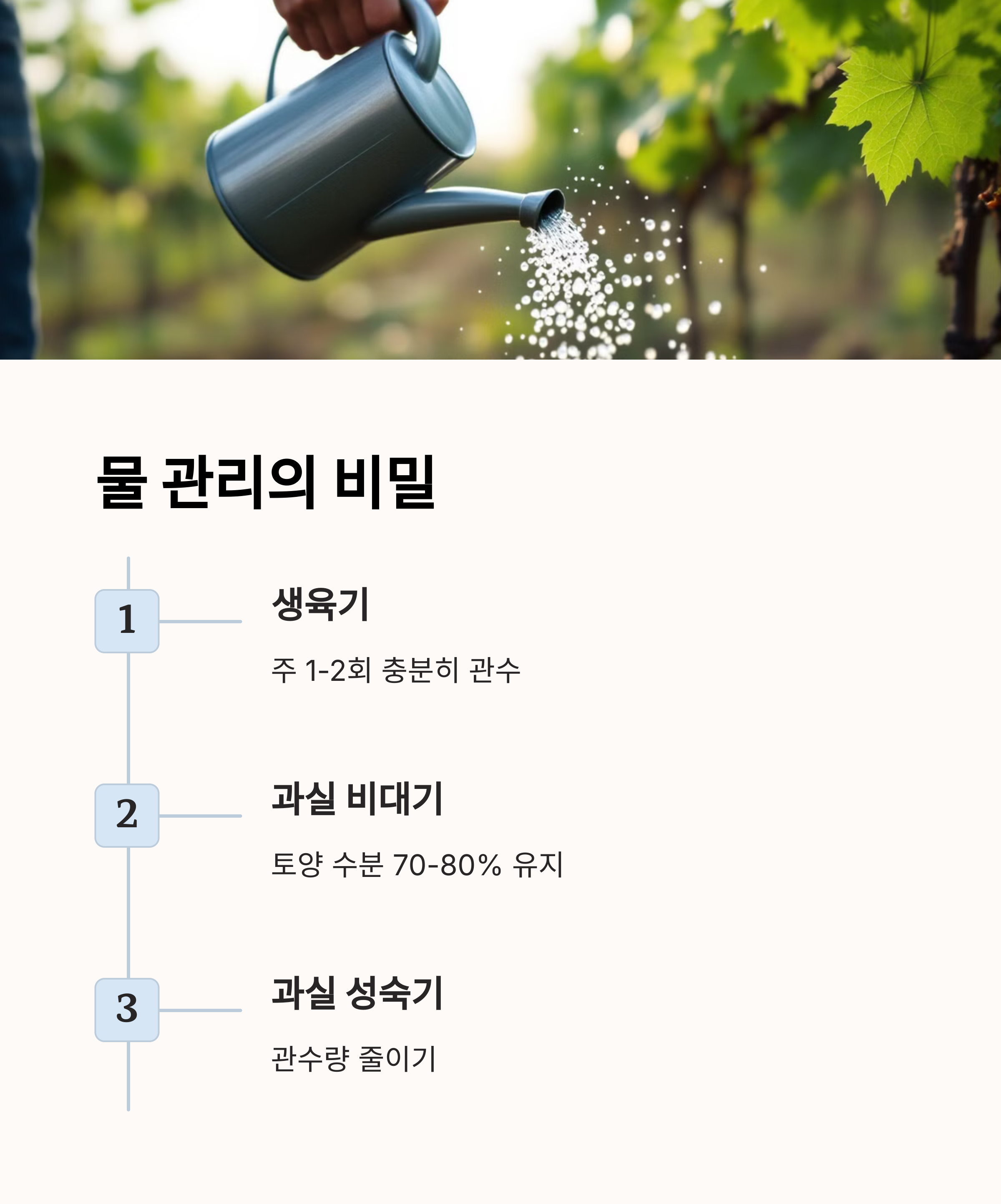 포도나무는 과하게 먹이면 오히려 열매 품질이 떨어져요. 적당히, 시기에 맞춰 주는 게 핵심이에요.