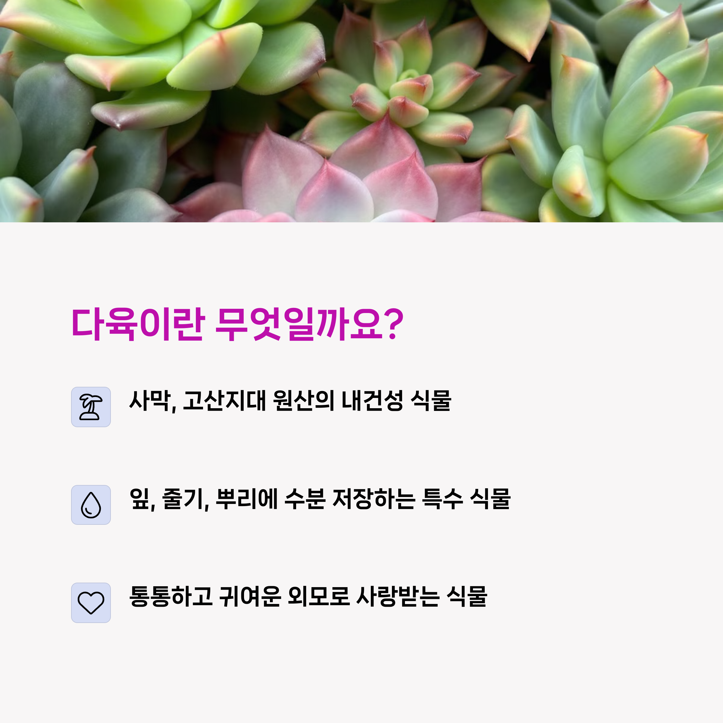 다육식물, 줄여서 ‘다육이’는 사막이나 고산지대처럼 물이 귀한 환경에서 살아남기 위해 진화한 식물이에요.