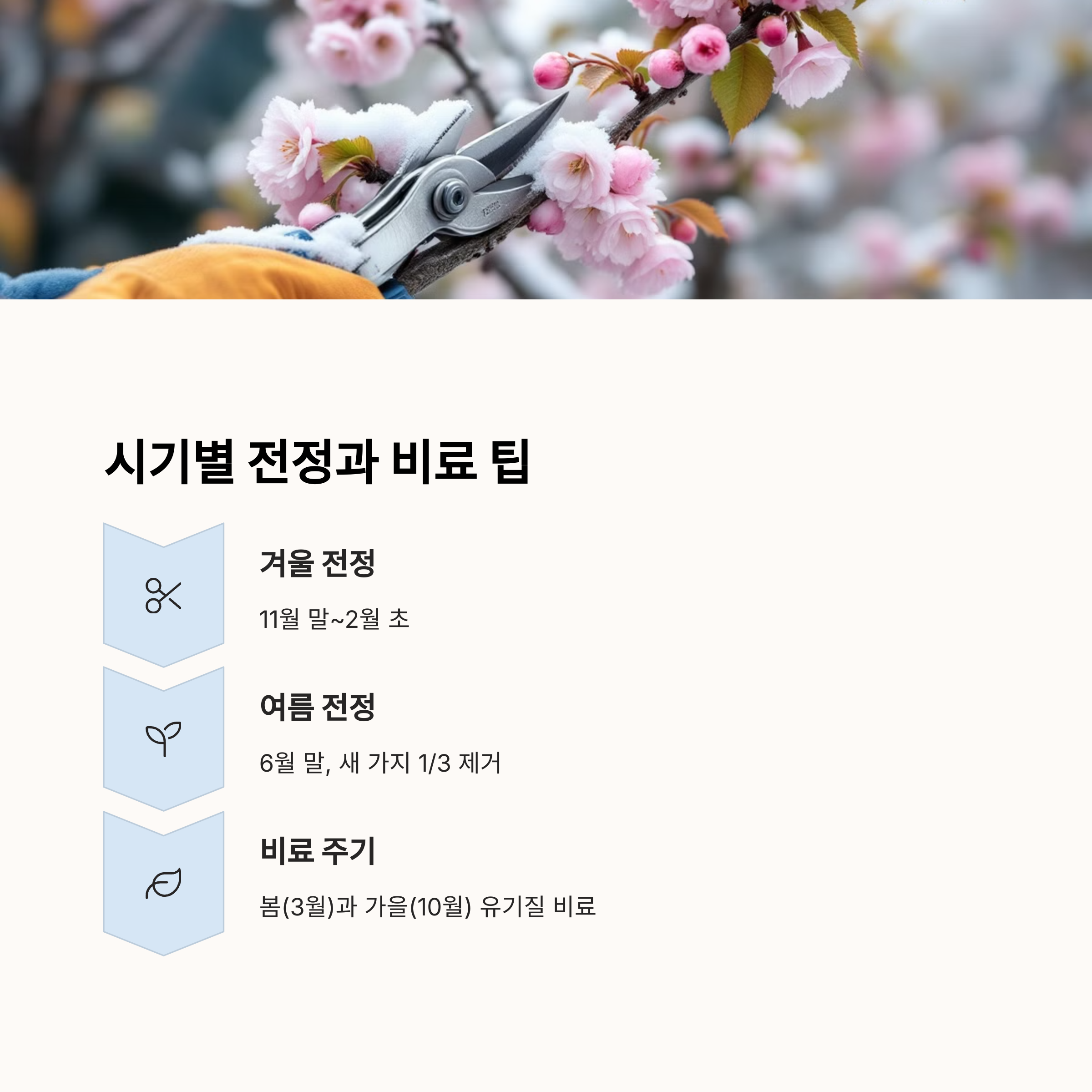 • 방법: 안쪽 가지 제거, 도장지(수직 가지) 제거 → 수형은 약간 위로 향하게 유지하면 꽃눈 생성에 좋아요.