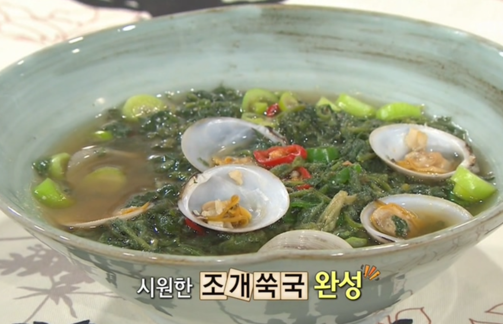 | 변형: 들깨 쑥국 | 쑥, 들깨가루, 된장, 바지락 | 1. 육수에 된장 풀고 바지락 넣기 2. 쑥+들깨가루 넣어 끓이기 |