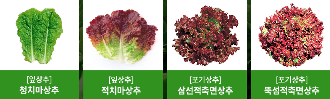 상추 종류는 대표적으로 적치마상추, 청치마상추, 적축면 상추, 청축면 상추 등이 있다.