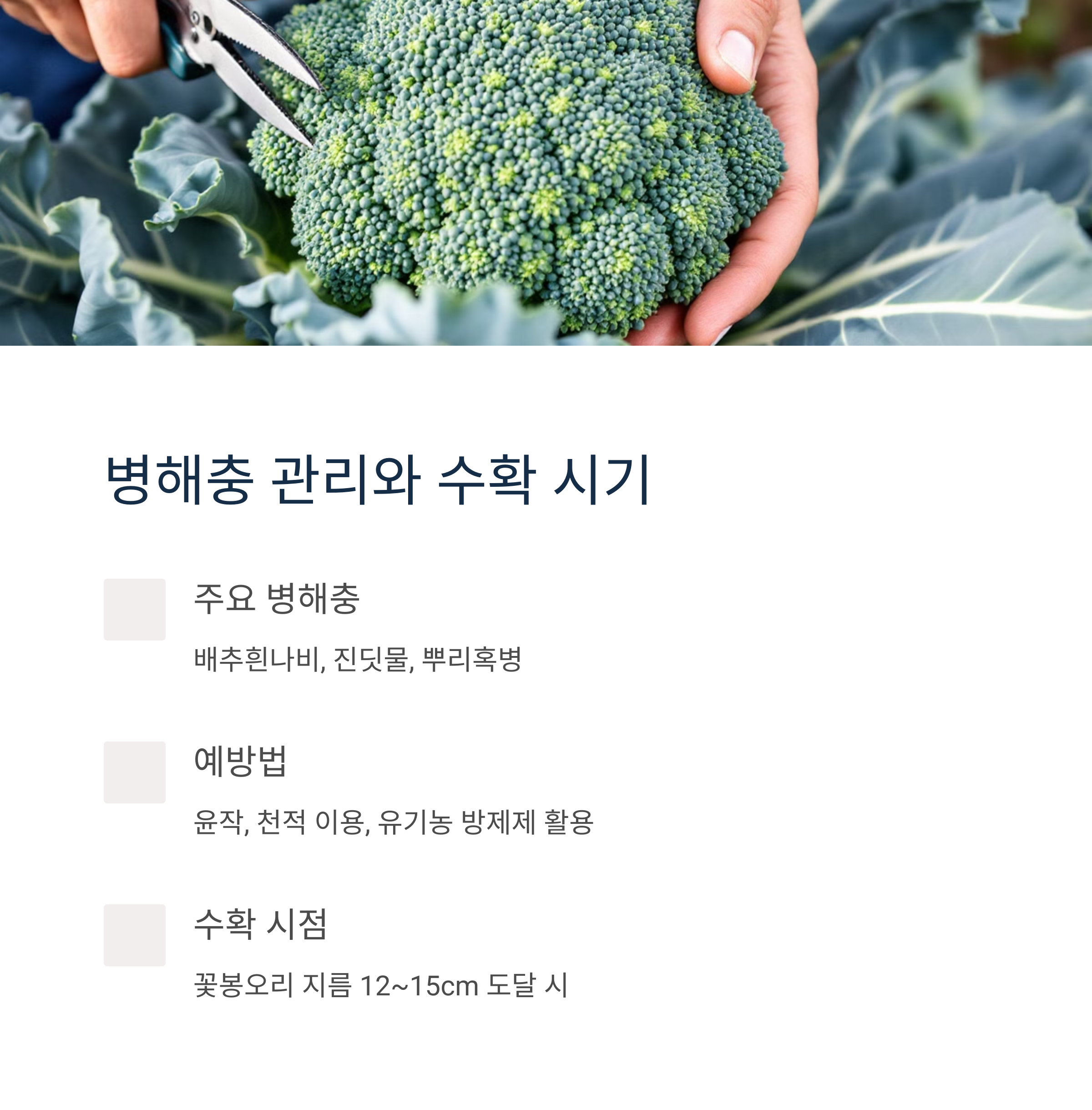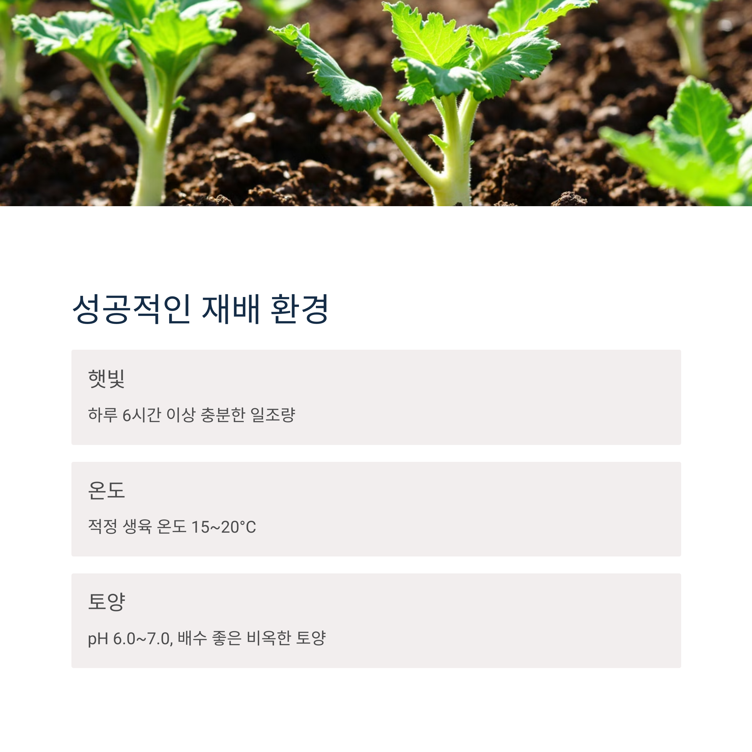 병충해: 진딧물과 배추흰나비 애벌레가 주요 적이에요. 친환경 방법으론 목초액(1:500 희석)을 뿌리거나, 주변에 금잔화를 심어 천적을 유인해보세요. 화학적 방제 시엔 등록된 약제(예: 디아지논)를 사용하세요.