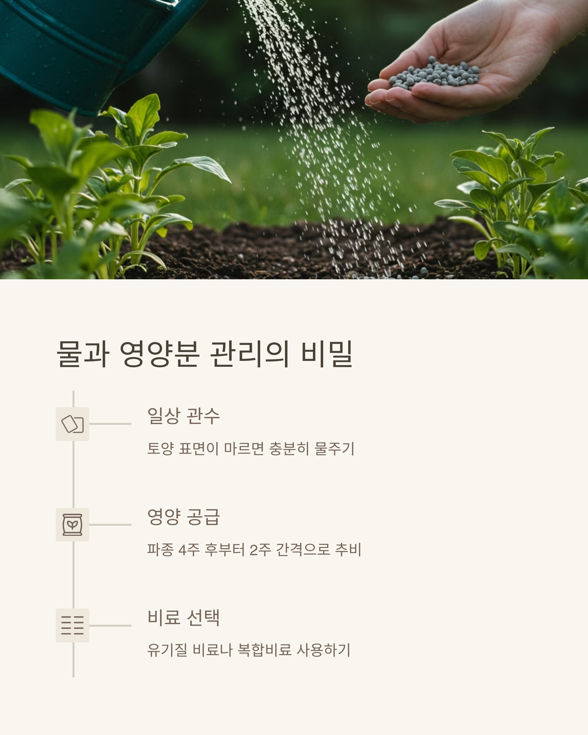 비료: 심은 후 3주 뒤부터 질소, 인, 칼륨이 균형 잡힌 비료(예: NPK 10-10-10)를 2~3주 간격으로 주세요. 과하면 잎만 무성해질 수 있으니 적당히!