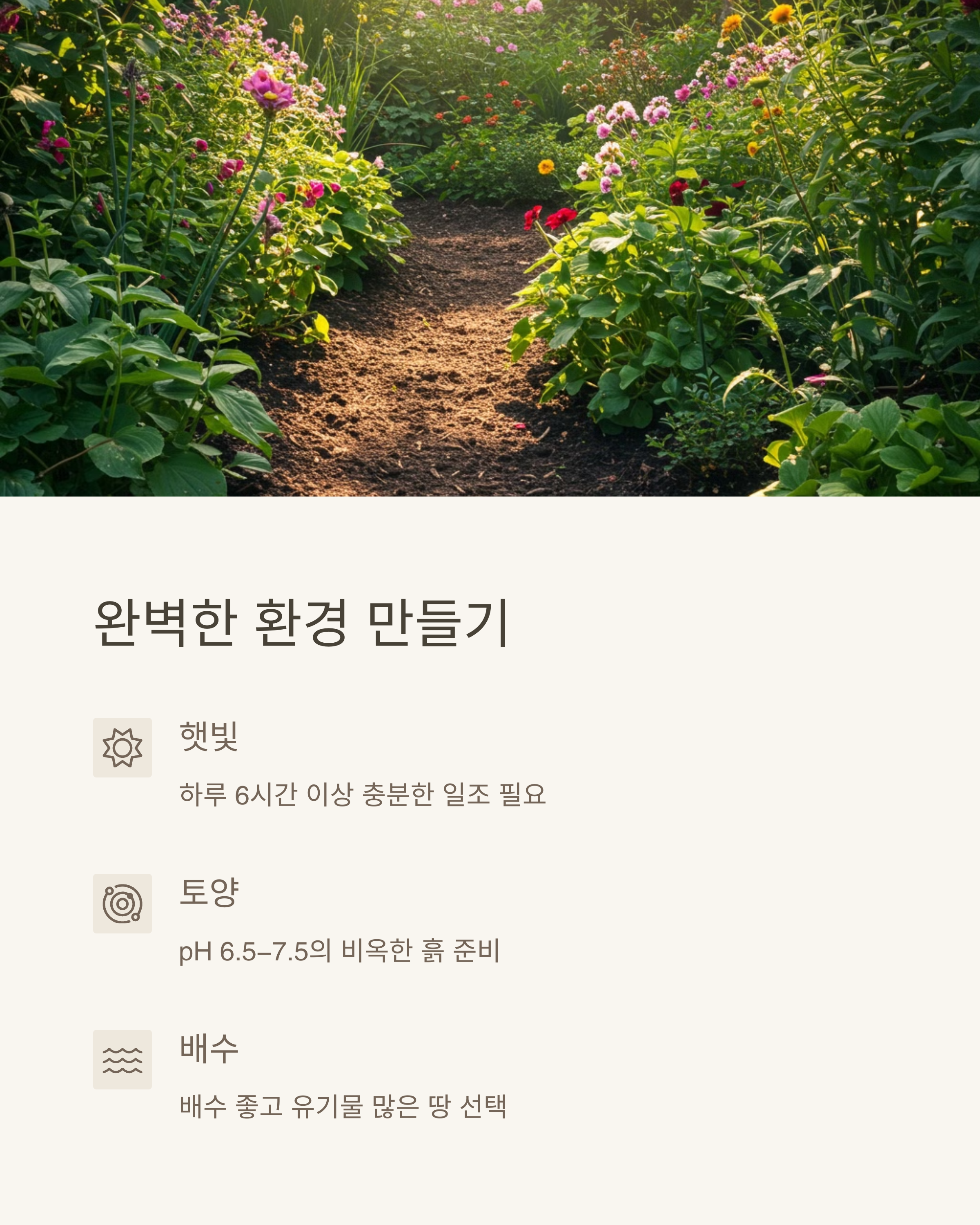 pH는 6.0~6.8 정도로 약산성이 이상적이에요. 토양이 너무 산성이면 석회를 뿌려 조절하세요.