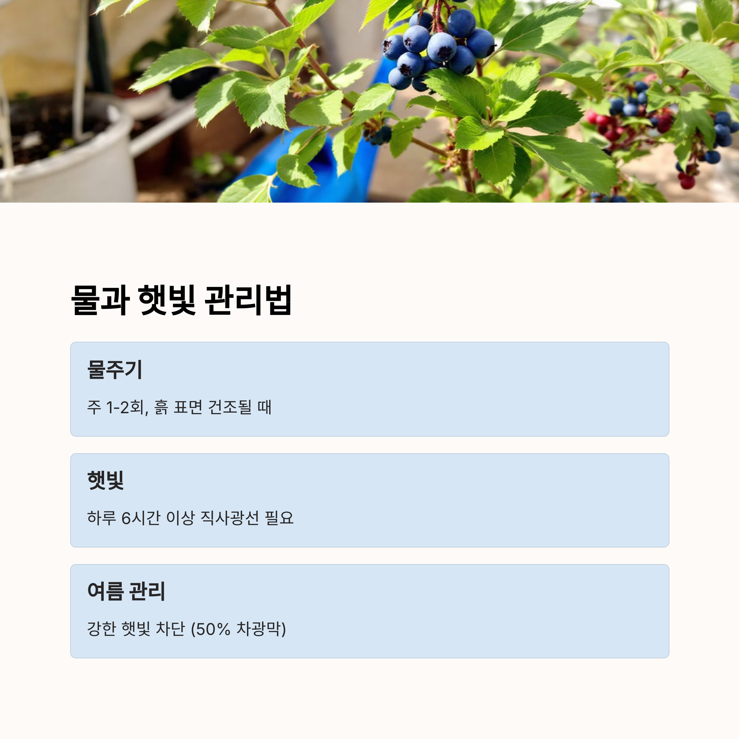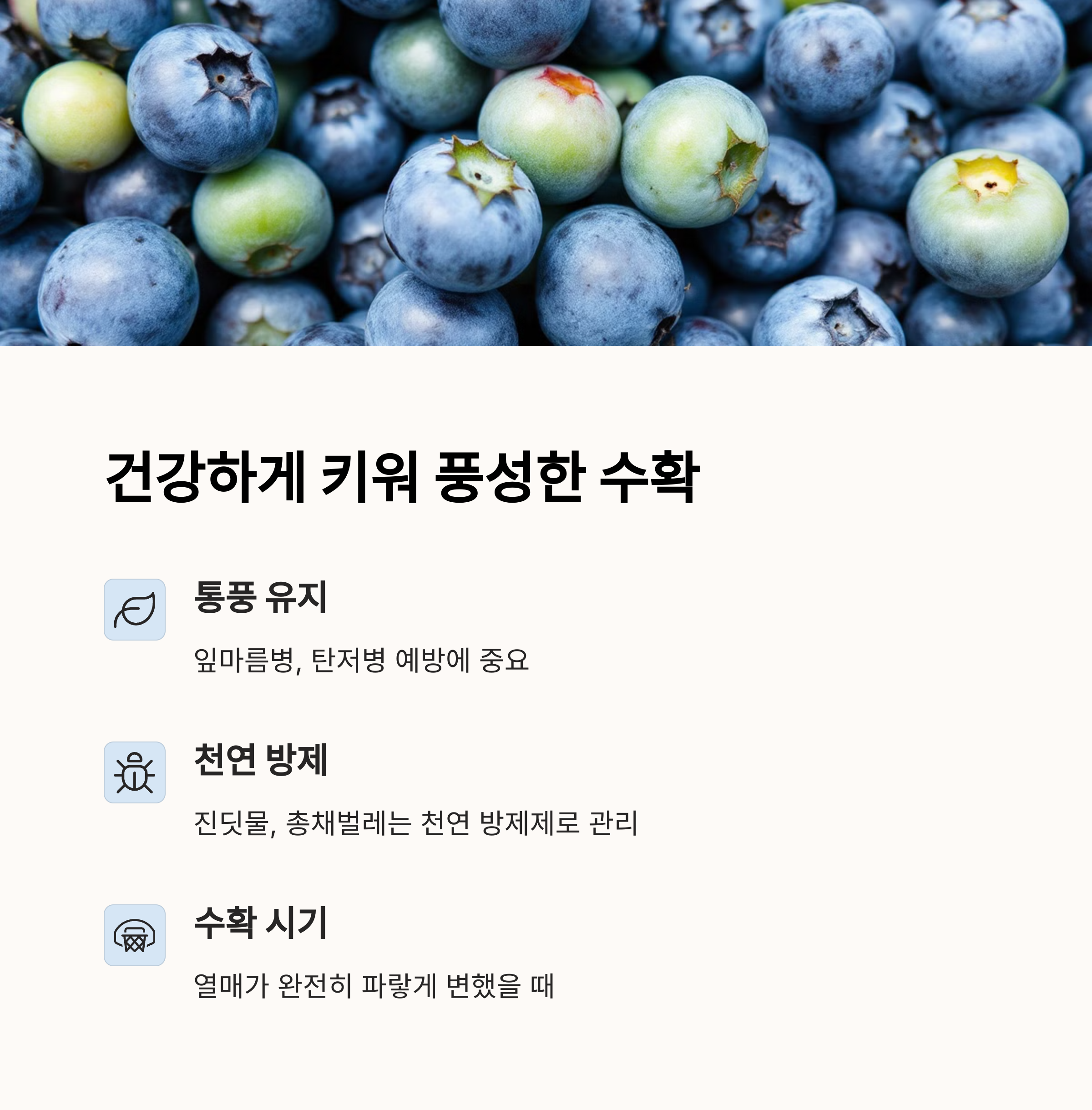 블루베리는 병충해에 강하지만, 여름철 고온다습한 환경에선 주의가 필요합니다.