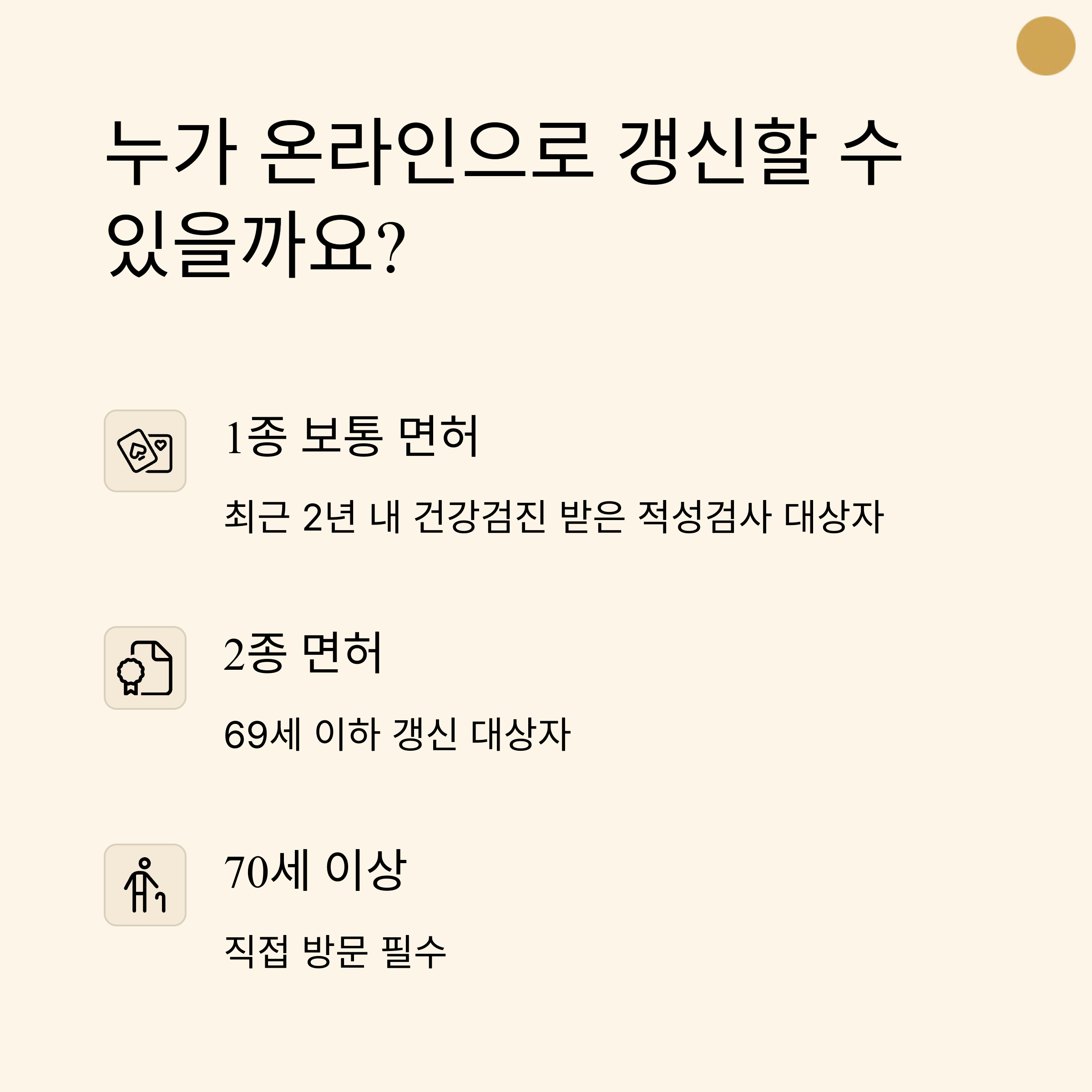 2종 면허: 69세 이하 갱신 대상자(70세 이상은 적성검사 필요).