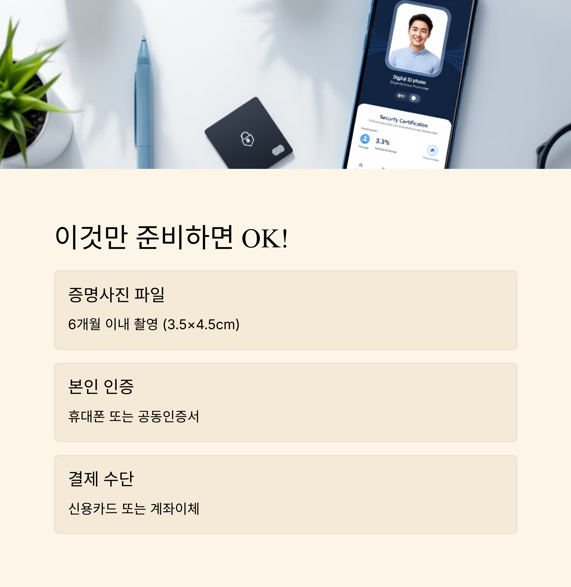 아니면 스마트폰 앱(예: ‘증명사진’ 앱)으로 셀카 찍고 규격에 맞춰 업로드해도 OK!