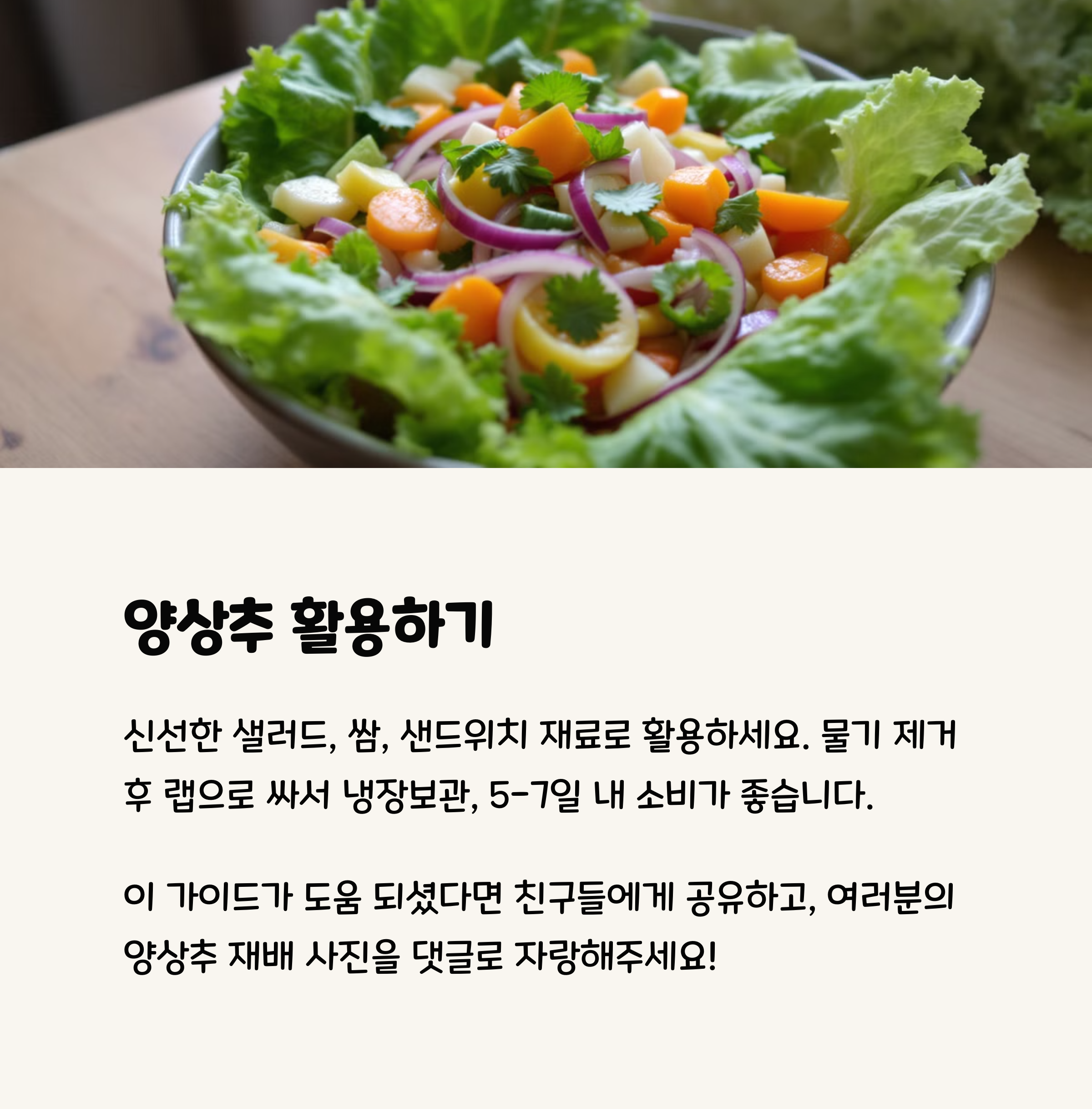양상추 재배는 초보자도 도전할 수 있는 보람찬 작업이에요. 텃밭에서 직접 키운 싱싱한 양상추로 샐러드를 만들어 먹는 날을 꿈꾸며, 여러분도 꼭 도전해보세요!