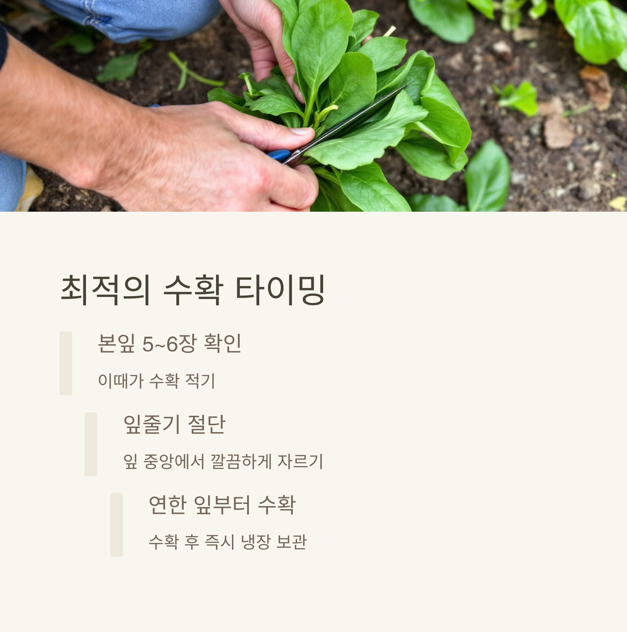 봄/여름은 30~40일, 가을은 50~60일 후 잎 8~15매일 때 수확해요. 꽃대가 오르면 품질이 떨어지니 늦지 않게요. 저는 뿌리 위 2cm를 가위로 잘랐더니 재생 수확도 가능했답니다.
