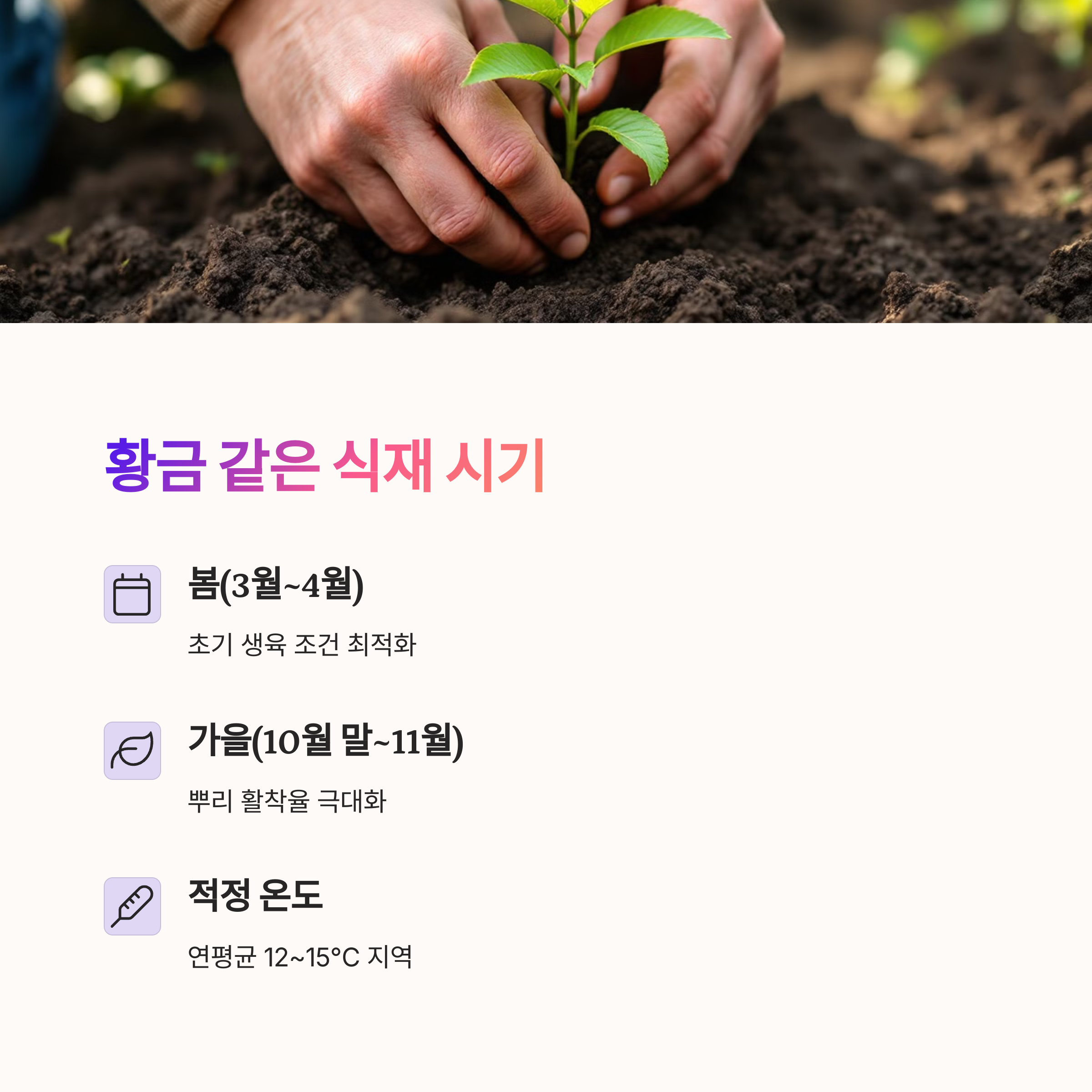 묘목 선택: 접목된 1~2년생 묘목을 추천. 실생묘는 품종 특성이 안 나와요.