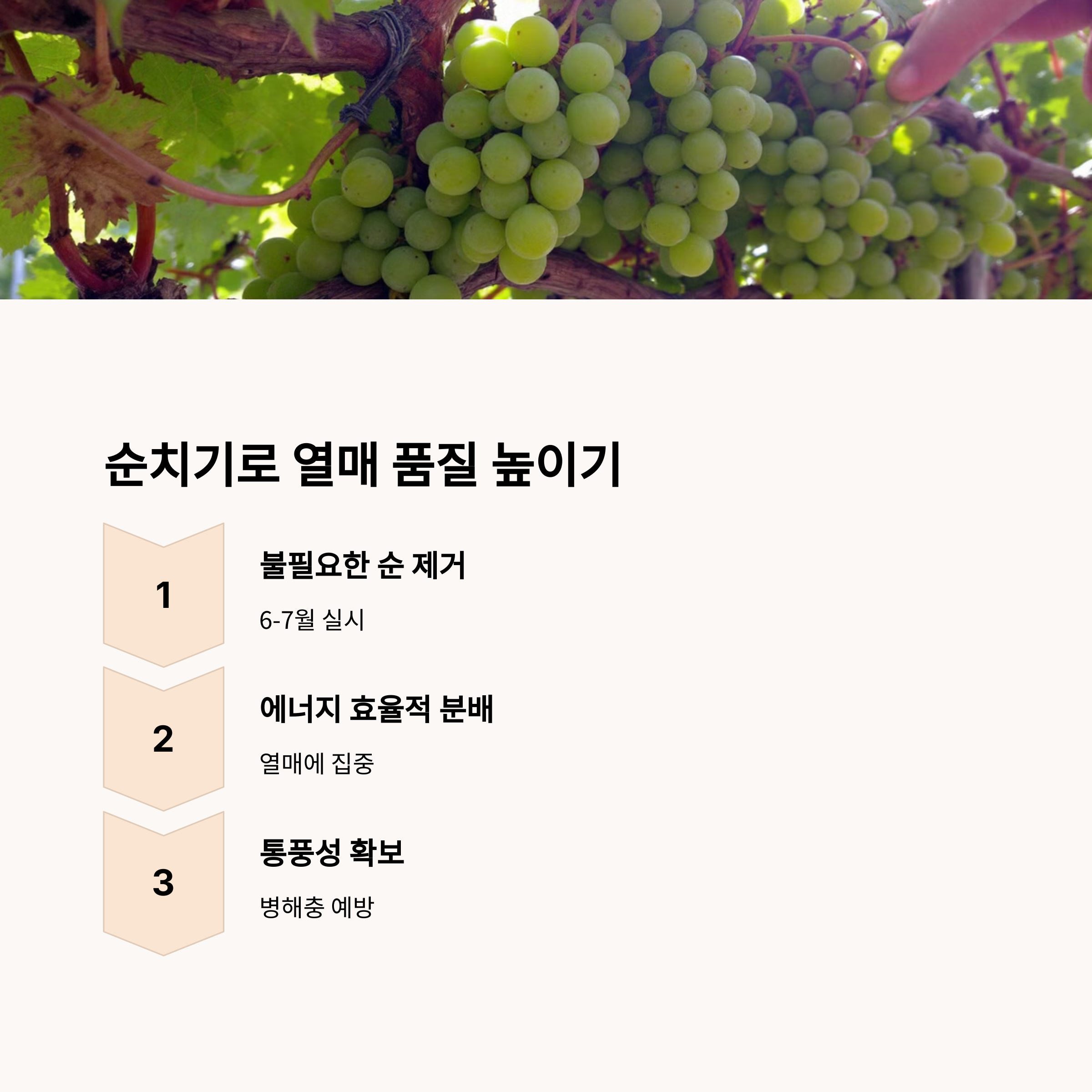 순치기는 포도나무의 제한된 에너지를 열매에 집중시켜 굵고 당도 높은 포도를 만드는 작업이에요.