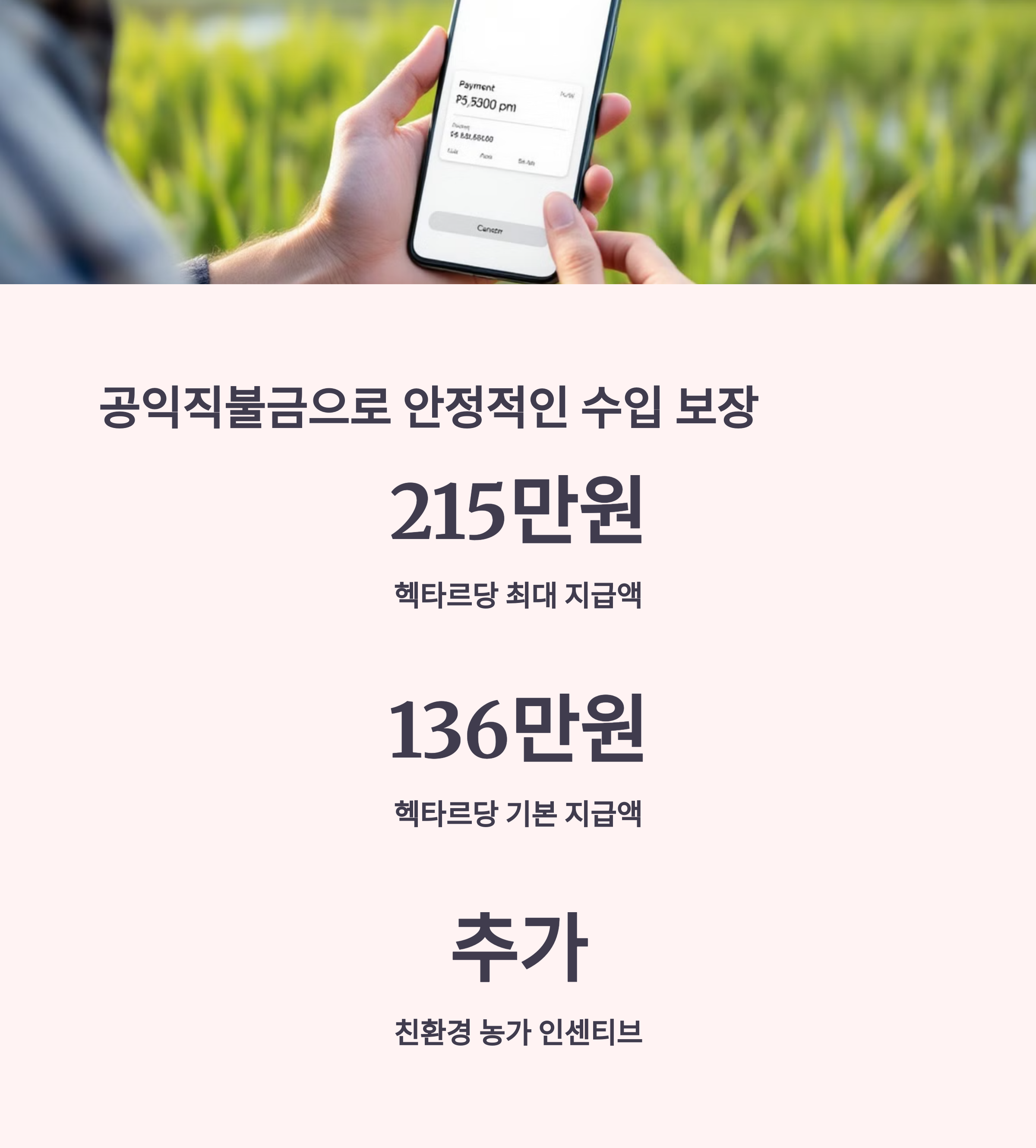 | 공익직접지불금 | 헥타르당 136만~215만 원 | 연 1회 | 농업경영체 등록, 환경 보전 활동 이행 |