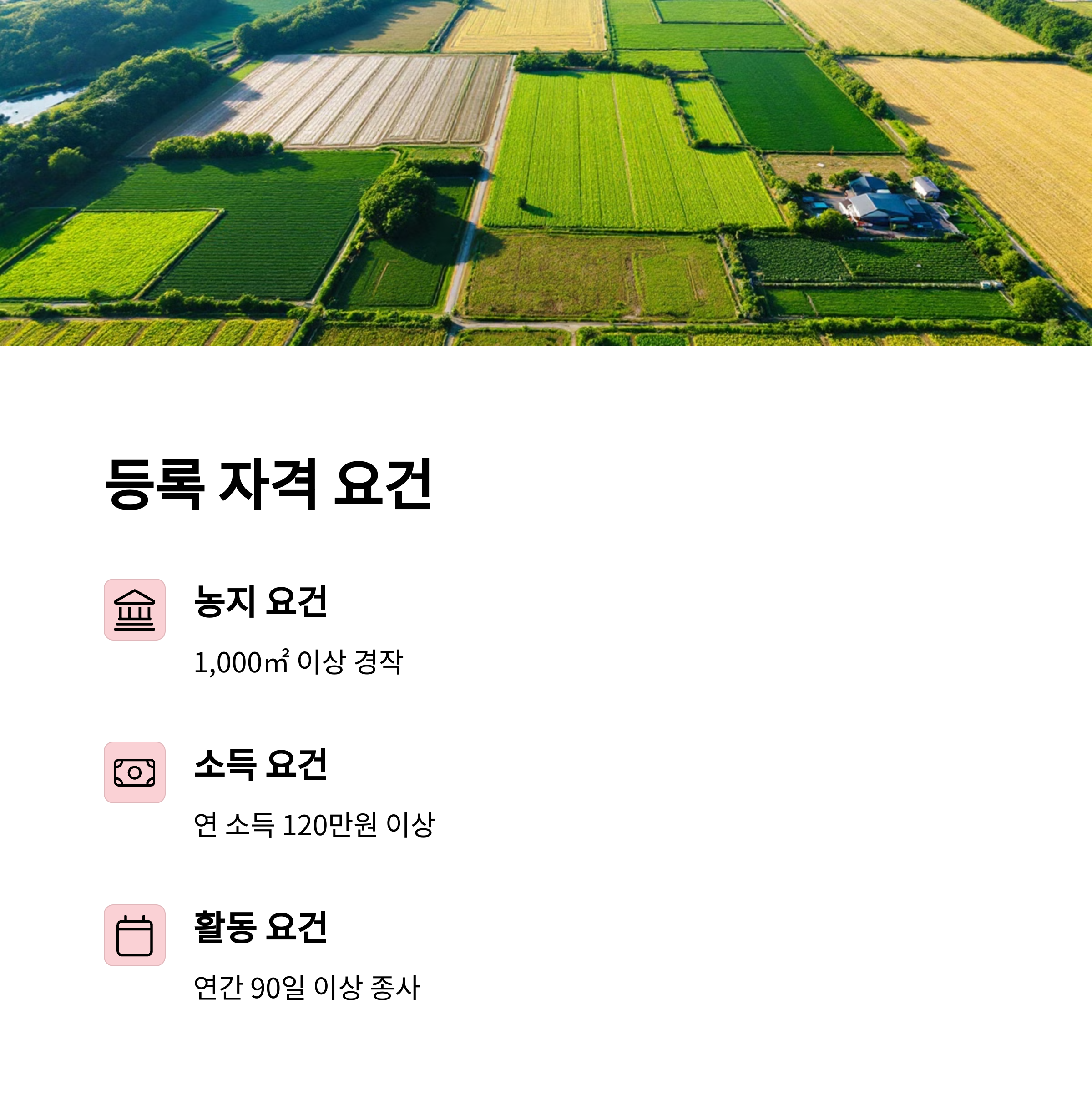 농지 면적: 1,000㎡(약 302평) 이상 농지에서 농작물을 경작하거나, 330㎡ 이상의 시설(비닐하우스, 온실 등)에서 재배.