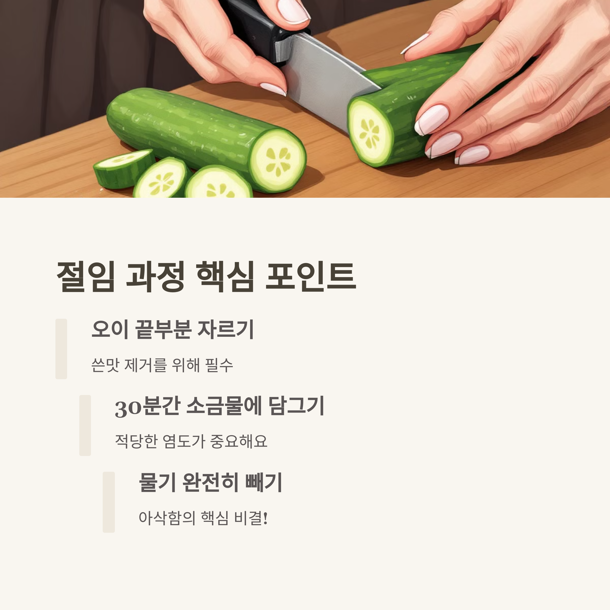 오이소박이의 아삭함은 절이는 과정에서 결정돼요. 저는 뜨거운 소금물과 찬물 온도 차를 활용해 식감을 극대화했어요.