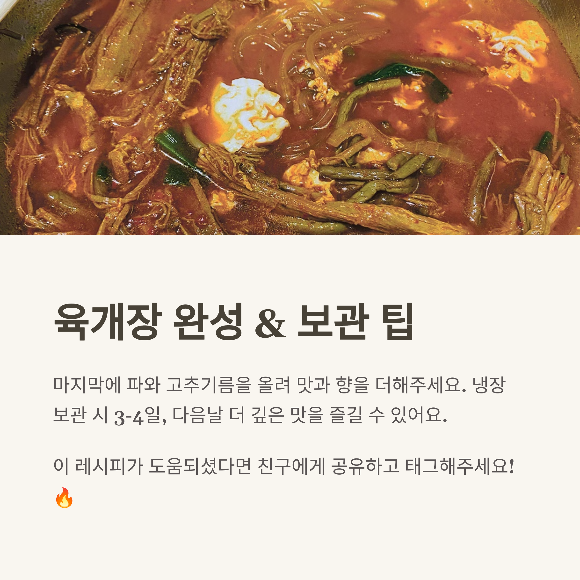 육개장은 손이 좀 가는 요리지만, 이 과정을 따라 하면 얼큰하고 깊은 맛의 국물을 집에서도 즐길 수 있어요.
