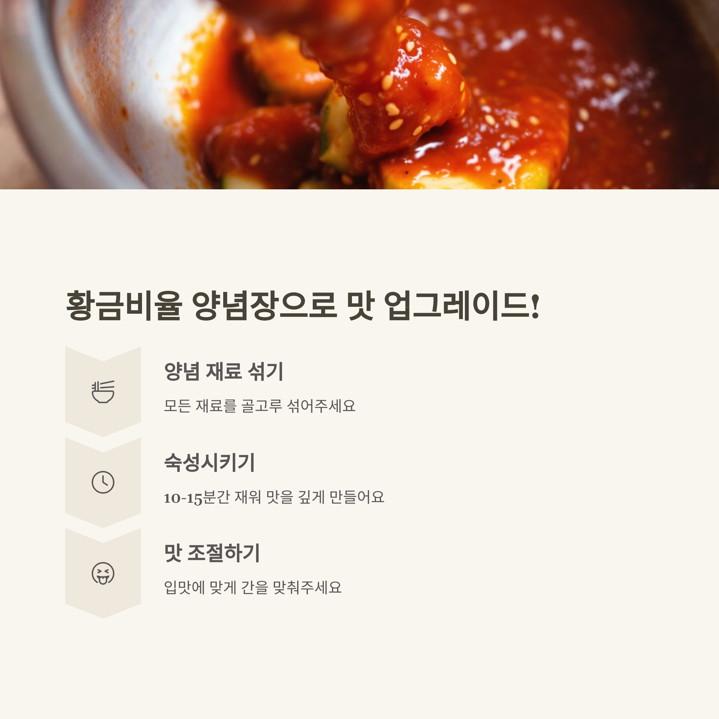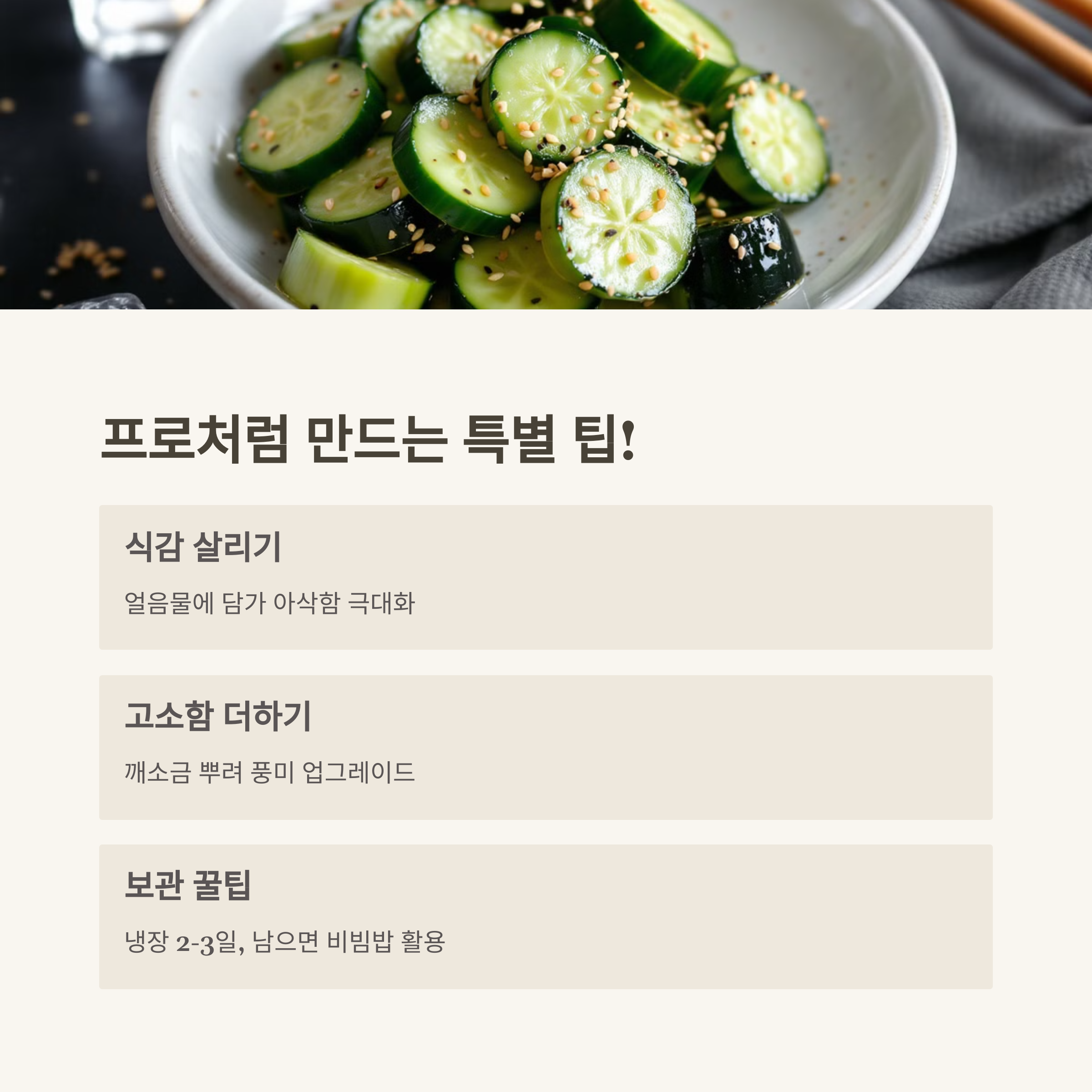💡 차별화 팁: 절인 오이를 얼음물에 5분 담갔다 꺼내면 더 아삭하고 신선한 식감이 돼요!