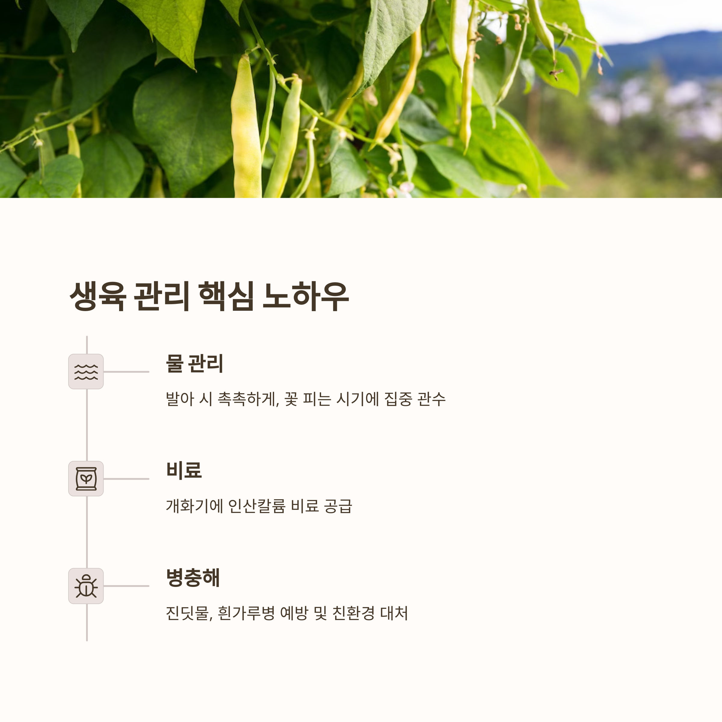 강낭콩은 물과 비료 관리만 잘하면 무럭무럭 자라요. 생육기간 동안 주의할 점들을 체크리스트로 정리했어요.