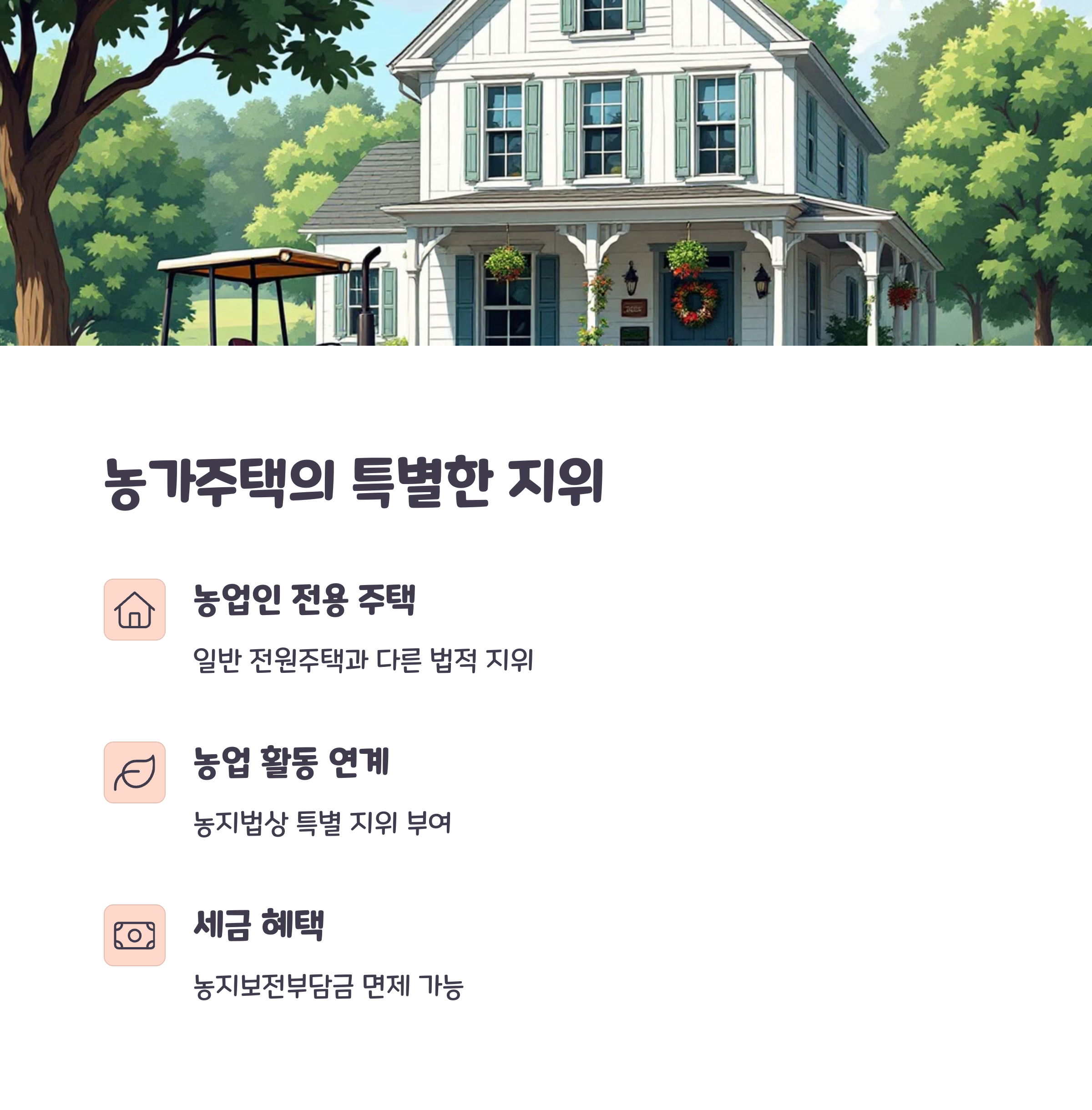흔히 ‘농어촌 주택’과 혼용되기도 하지만, 법적으로는 농지법과 건축법에 따라 농업인 주택으로 구분됩니다.