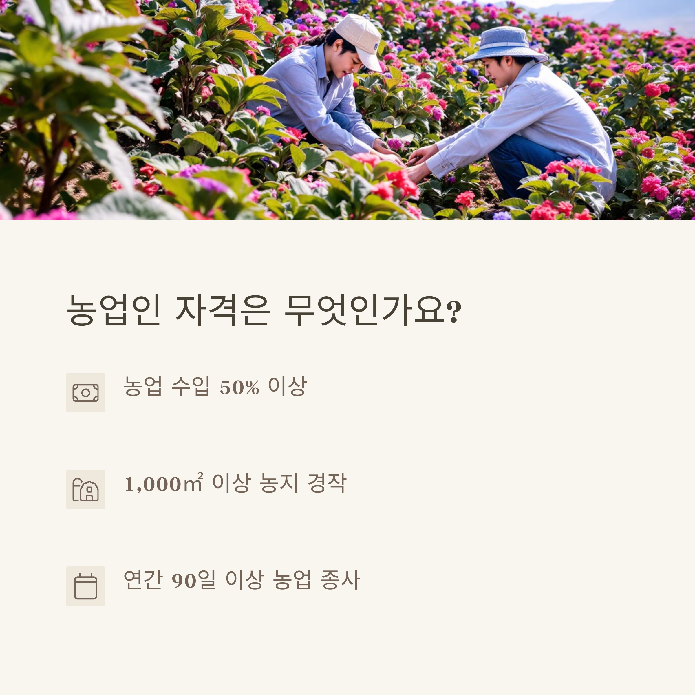 | 농지 요건 | 1,000㎡ 이상 경작 또는 300㎡ 비닐하우스 |