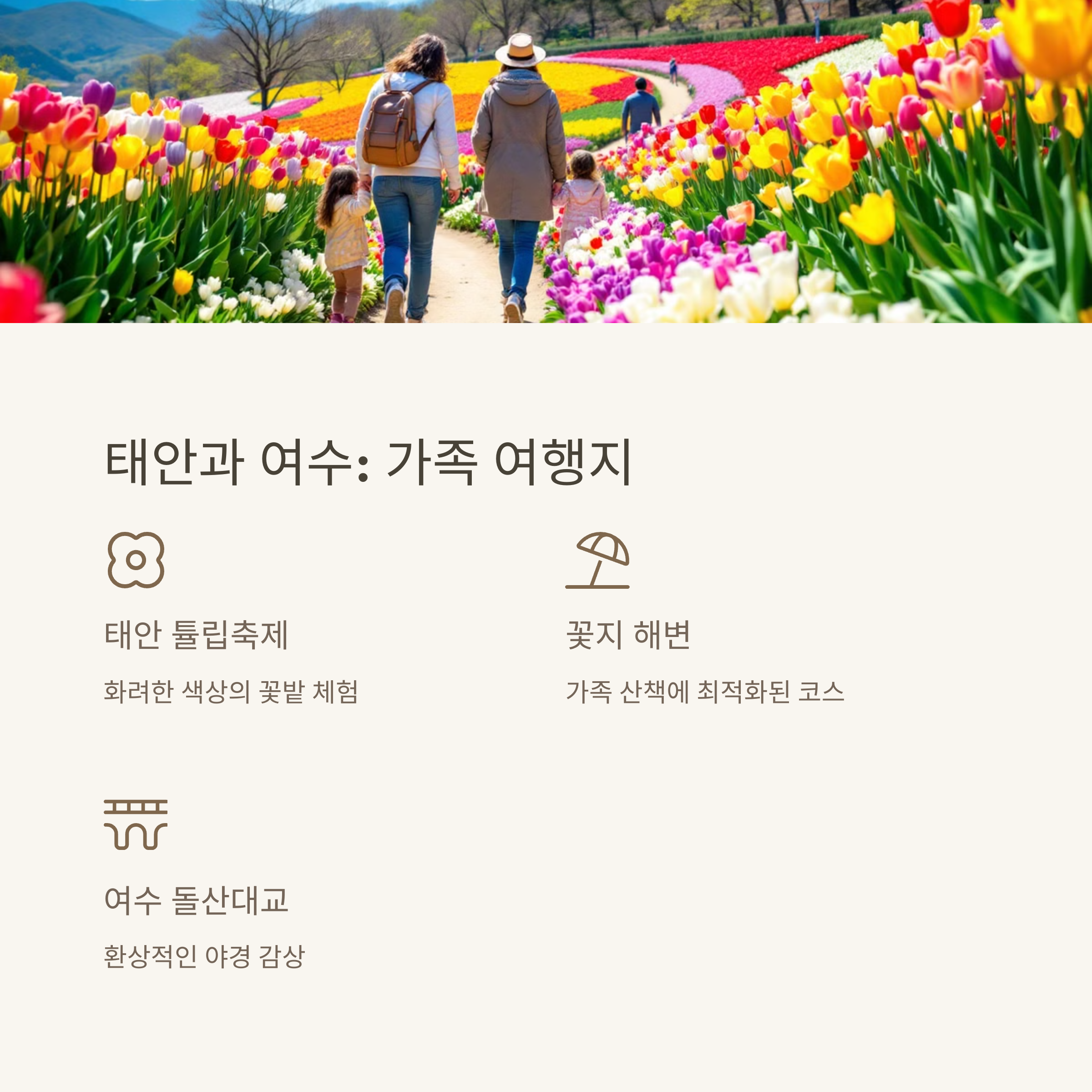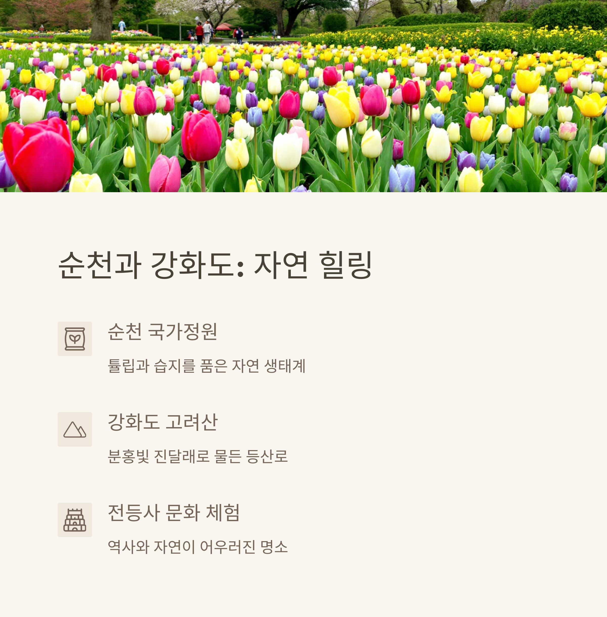 충남 태안의 세계 튤립축제(4월 15일~5월 10일 예상)는 200만 송이의 튤립이 펼쳐지는 장관이에요. 꽃지 해변과 연계하면 봄바다까지 즐길 수 있어 4월 국내 여행지 추천으로 딱이죠.