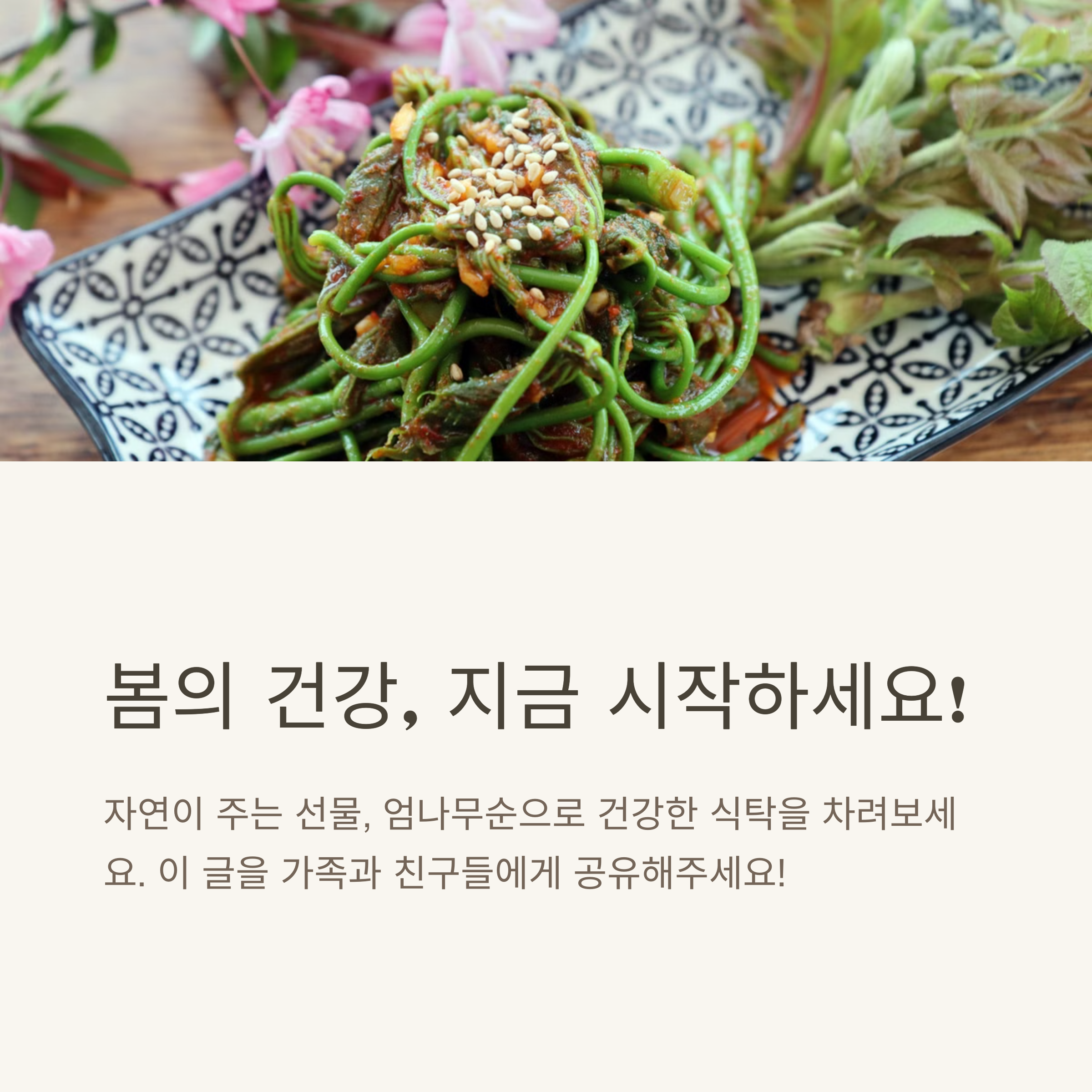 5월 중순까지 채취 가능하지만 질겨질 수 있어요. 어린 순을 골라 데친 뒤 부드럽게 조리하세요.