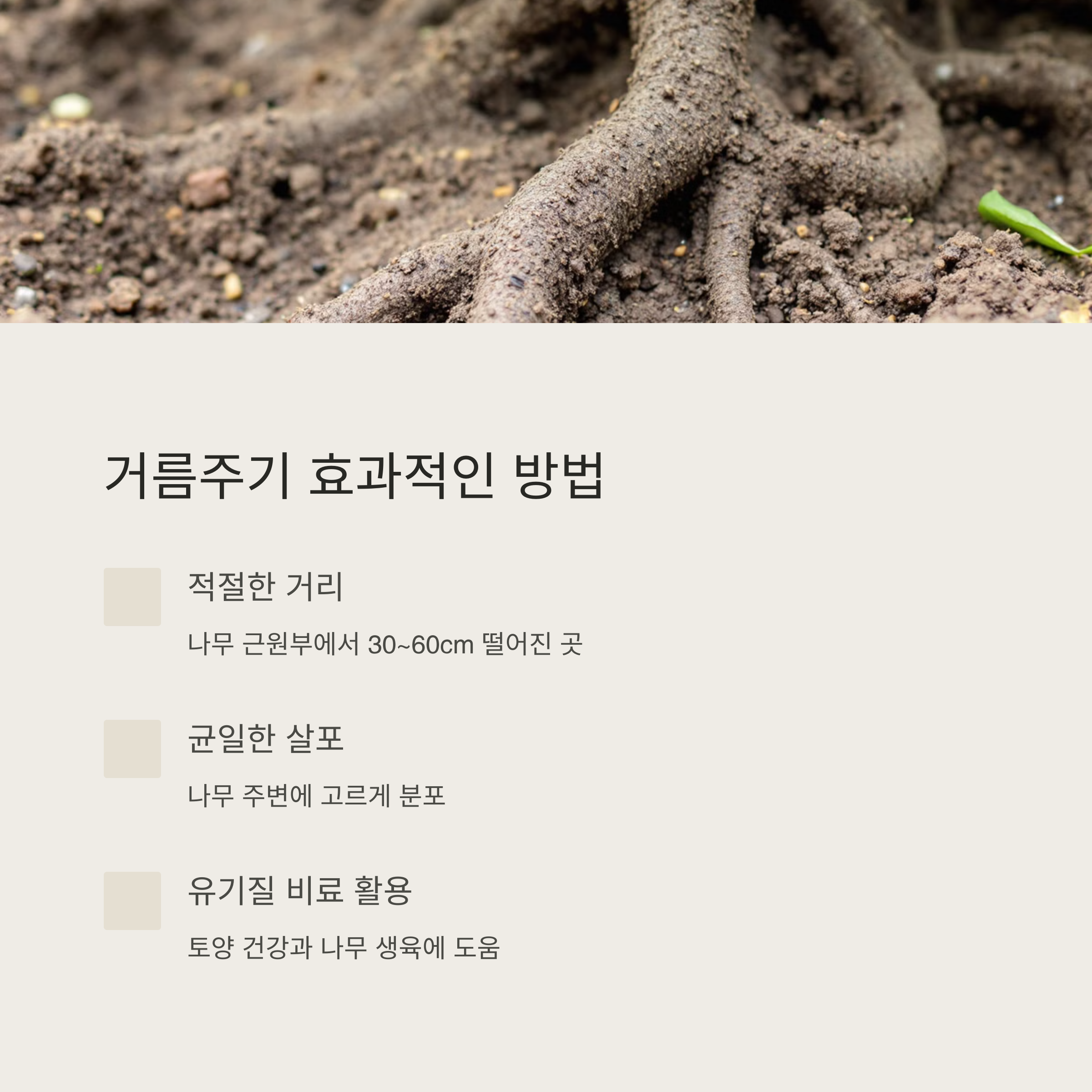 거름은 나무 뿌리에서 30~60cm 떨어진 곳에 고르게 뿌리고, 흙과 섞어주면 흡수가 잘돼요.