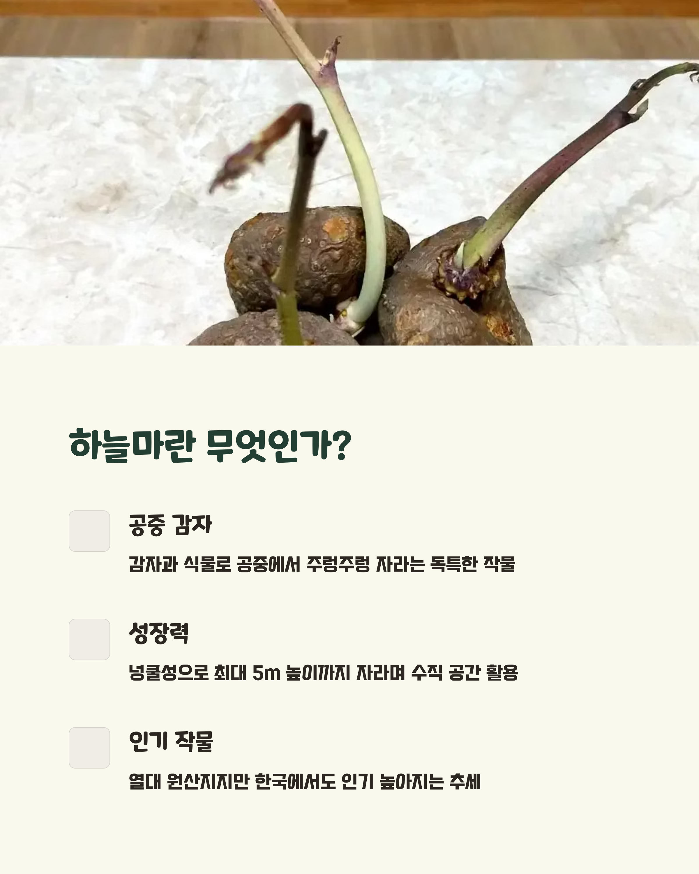 어렵지 않은 재배 과정으로 집에서도 신선한 하늘마를 맛볼 수 있어요.