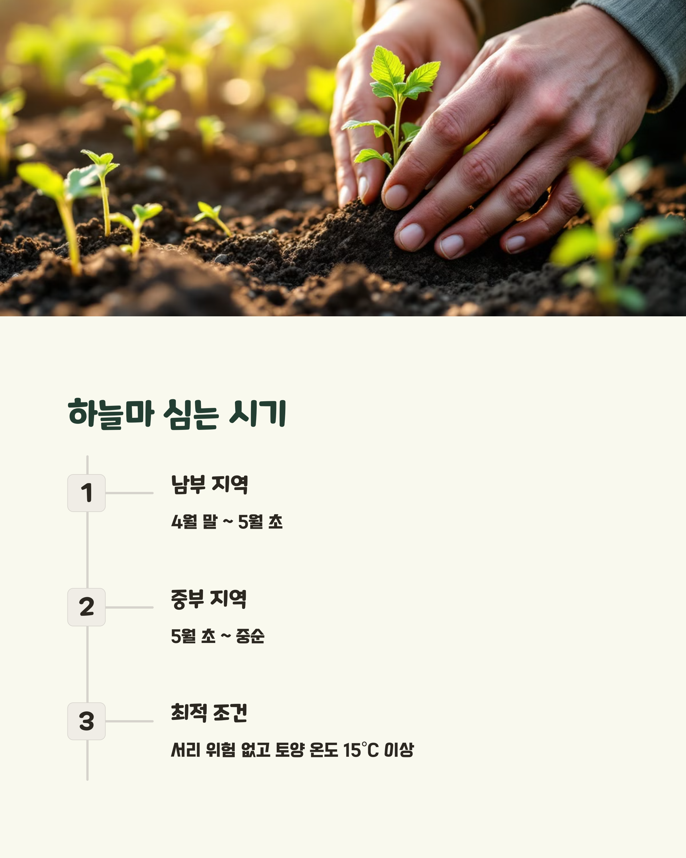 - 하늘마 심는시기는 5월 초, 서리가 끝난 후가 최적이에요.