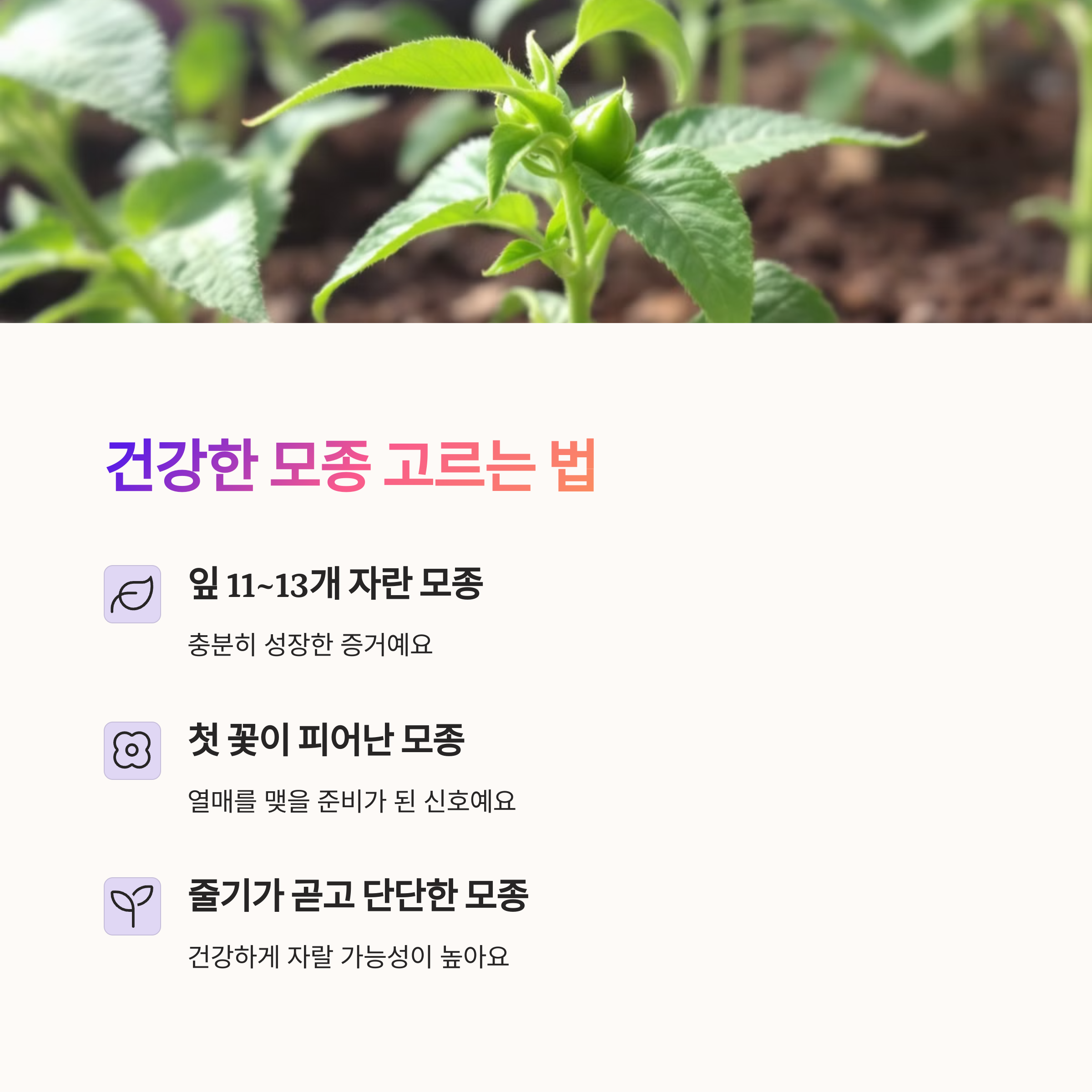 튼튼한 모종을 골라야 잘 자라요. 체크 포인트는:
