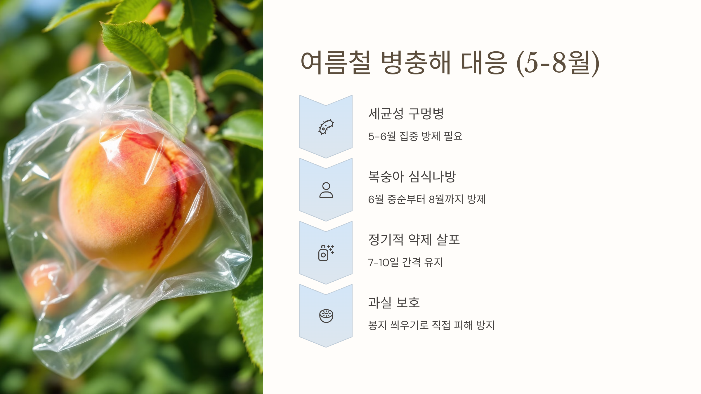 5월부터 세균성 구멍병과 잿빛무늬병이 나타날 수 있어요. 다코닐 또는 안트라콜(1000배)을 10일 간격으로 2~3회 뿌리세요. 6월 중순부터는 복숭아 심식나방 방제로 토양살충제(카보입제)를 사용하고, 과실 봉지 씌우기를 병행하면 좋아요 🥕.