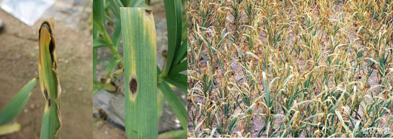 잎마름병 증상(왼쪽, 가운데)과 잎마름병이 퍼진 재배지(오른쪽)