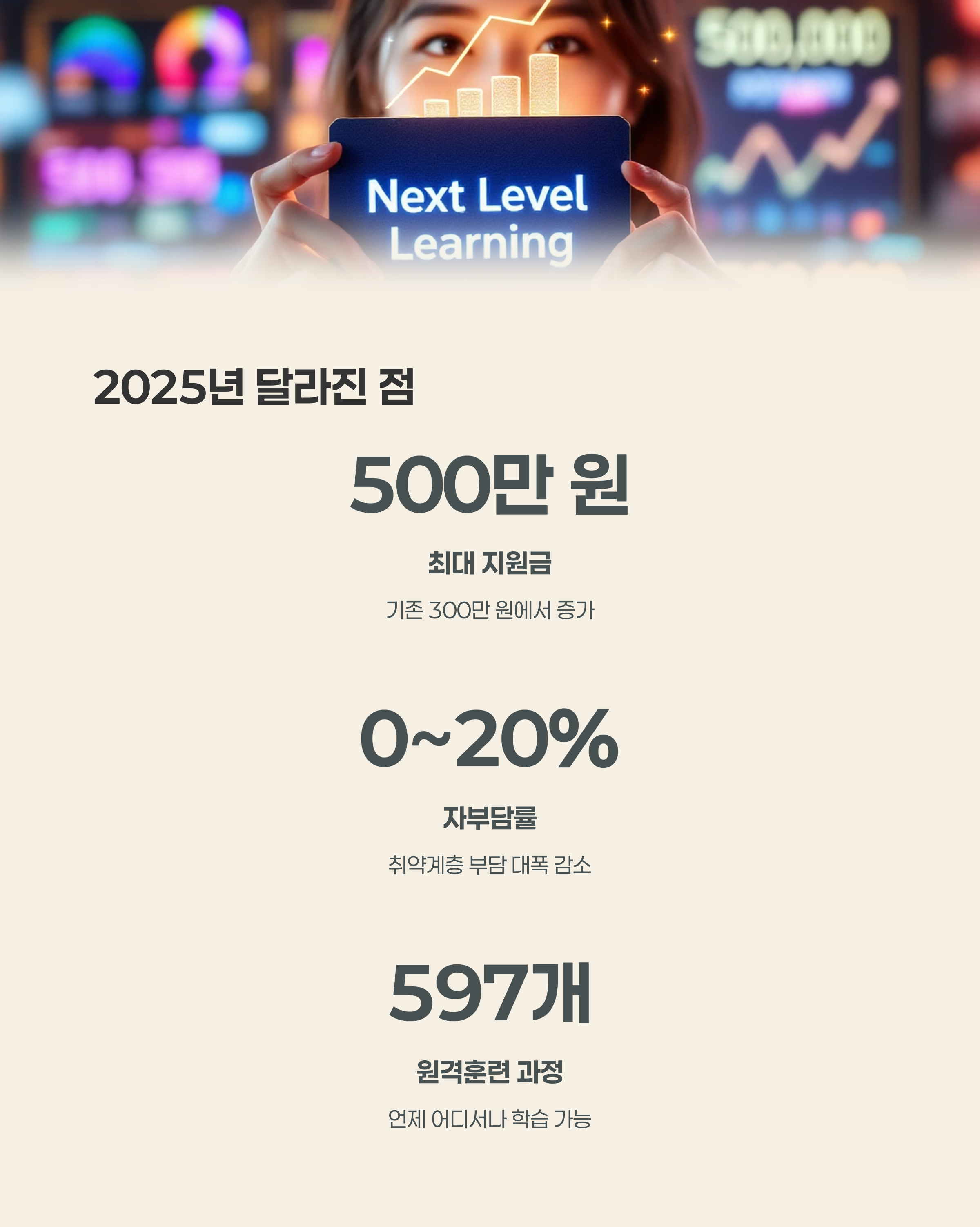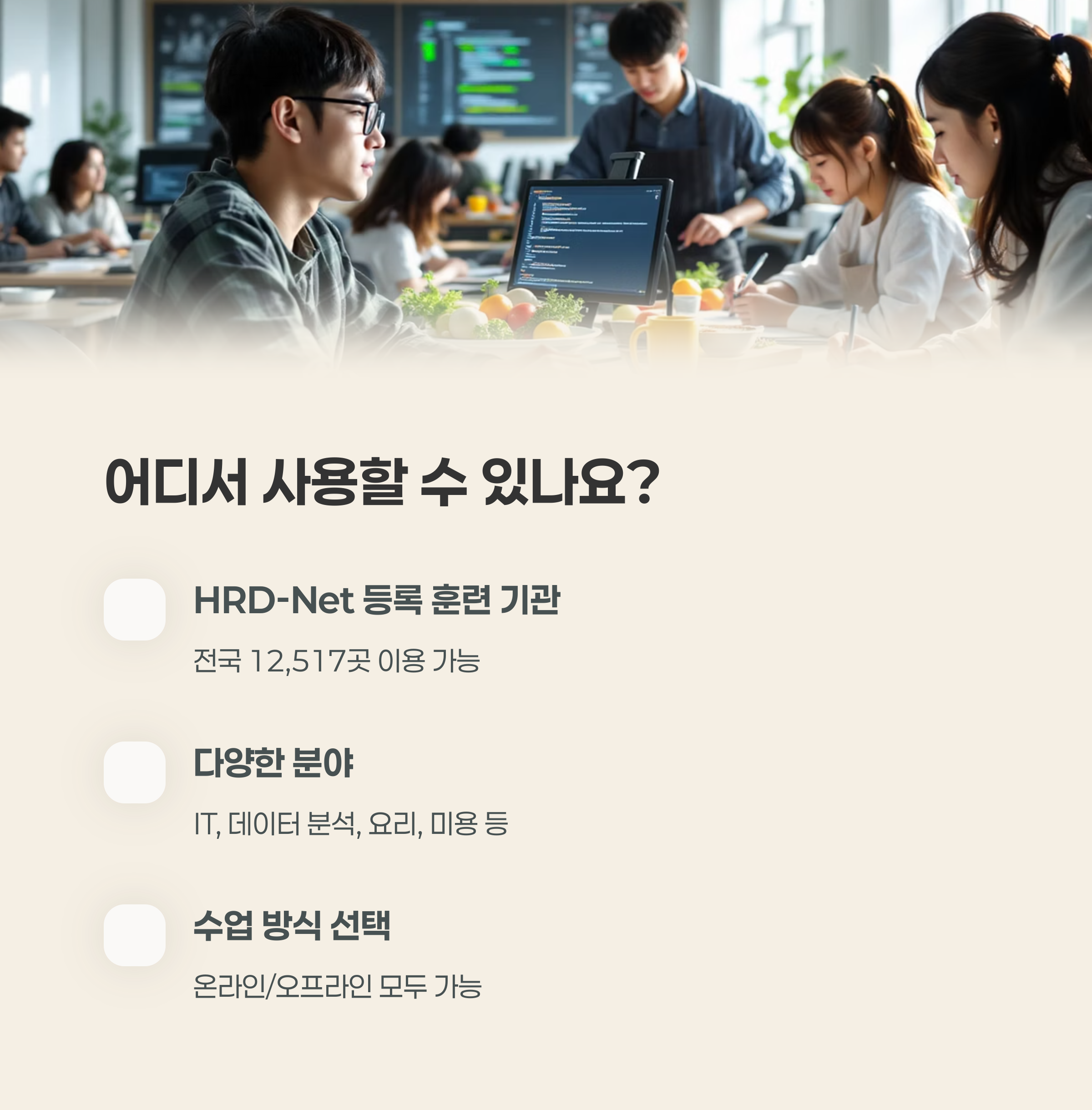구직자, 재직자, 자영업자, 대학생 등 다양한 대상이 IT, 서비스, 디자인 등 원하는 교육을 받을 수 있어요. 2025년에는 훈련 과정과 사용처가 더욱 확대되었습니다.