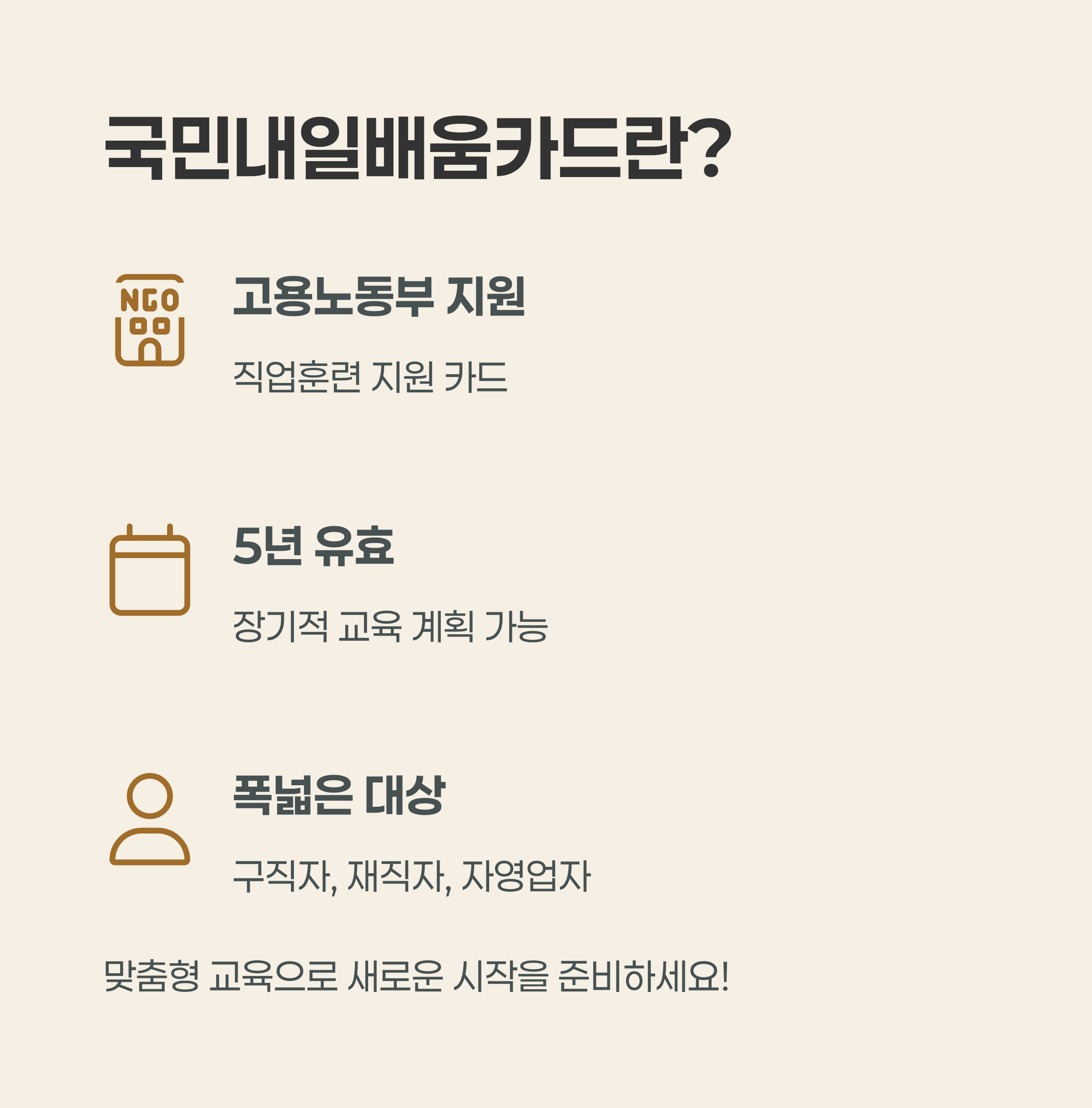 국민내일배움카드는 고용노동부가 제공하는 직업훈련 지원 제도로, 최대 500만 원(기본 300만 원, 추가 지원 100~200만 원)의 훈련비를 5년간 사용할 수 있습니다.