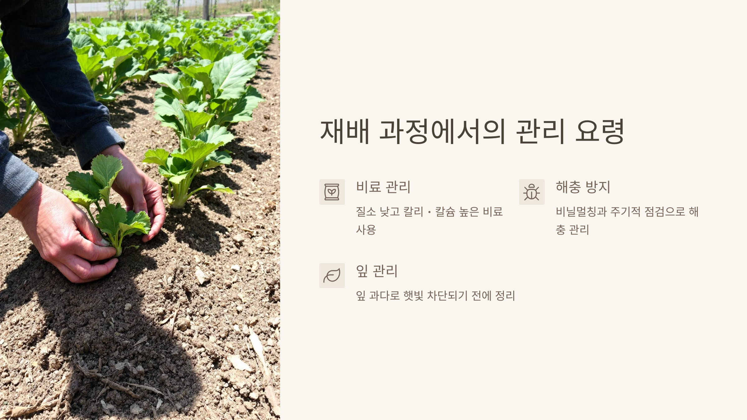 병충해: 진딧물과 배추흰나비를 주의하며, 친환경 농약(니름유) 사용 추천.
