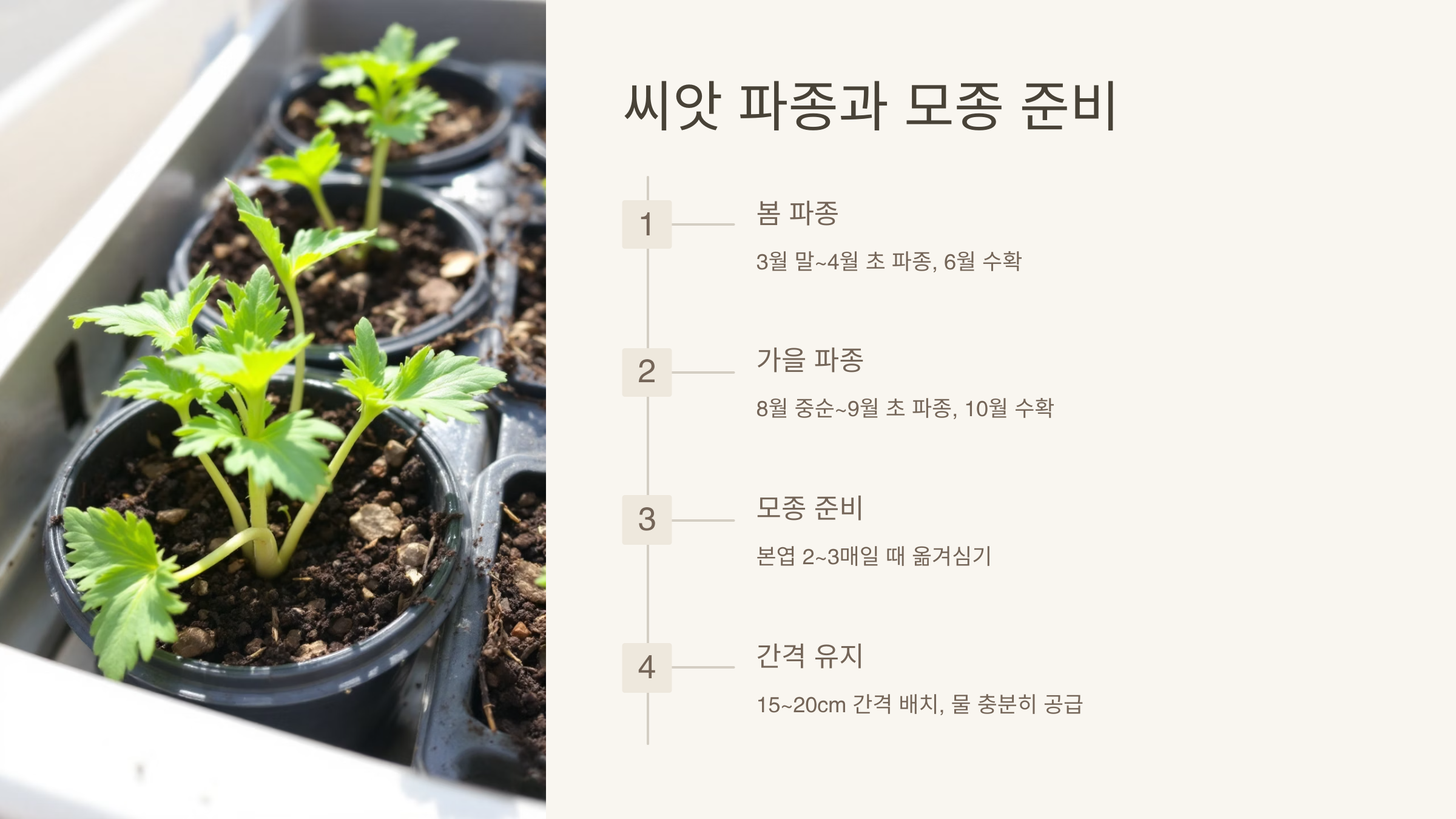 팁: 씨앗을 전날 물에 담가 발아율을 높이고, 저온(10°C 이하)에서는 비닐로 보온하세요.