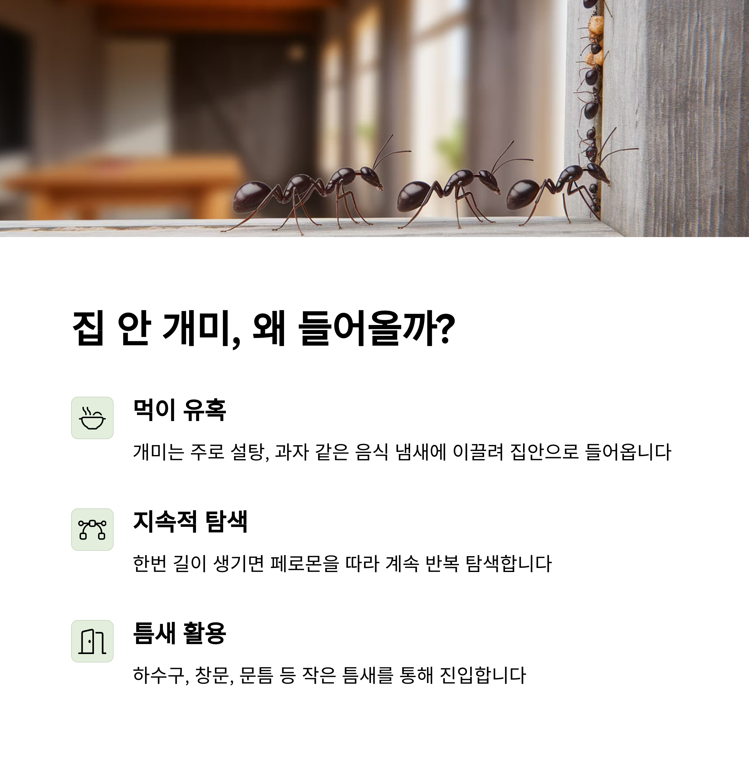 개미는 사실 단순해요. 먹이 냄새가 나면 따라오고, 물이 있으면 정착하고, 틈이 있으면 들어옵니다. 특히 단 음식이나 고기 국물 같은 강한 냄새에 아주 예민하게 반응하죠.