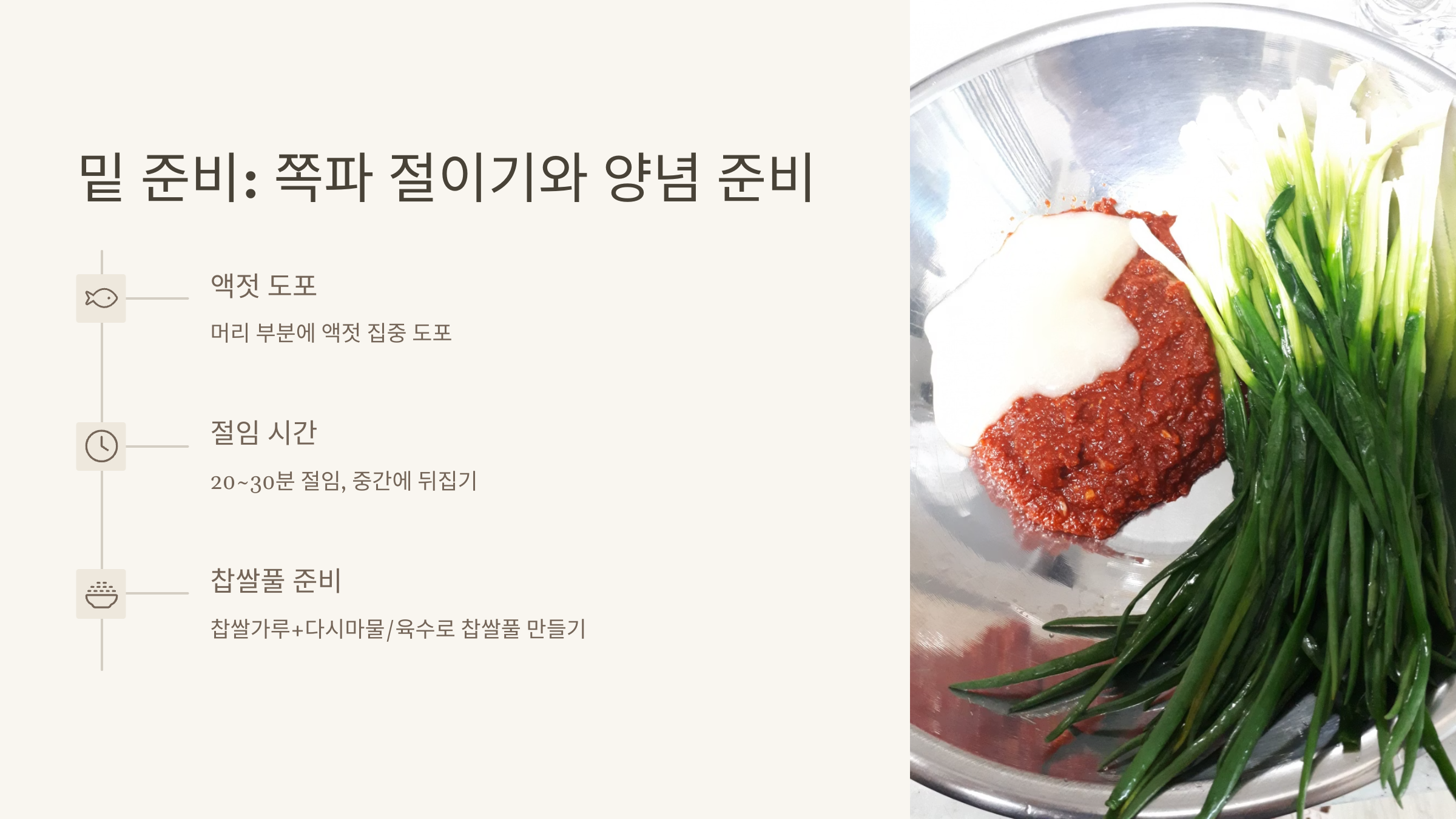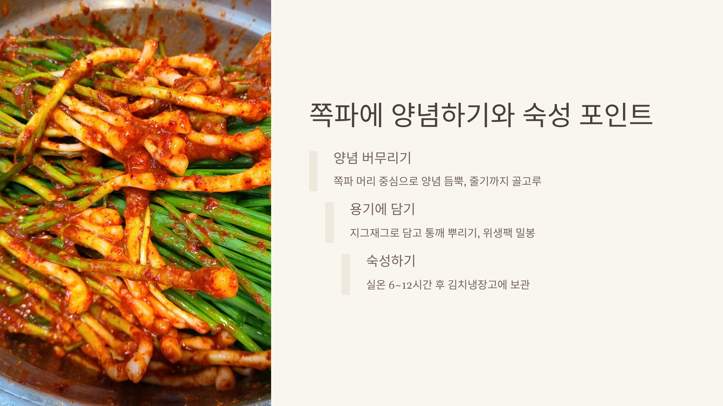 신선한 쪽파를 사용하고, 세척 후 물기를 완전히 제거하세요. 양념 주무를 때 살살 버무려 섬유질 손상을 최소화하고, 실온 발효는 1~2일로 제한합니다.