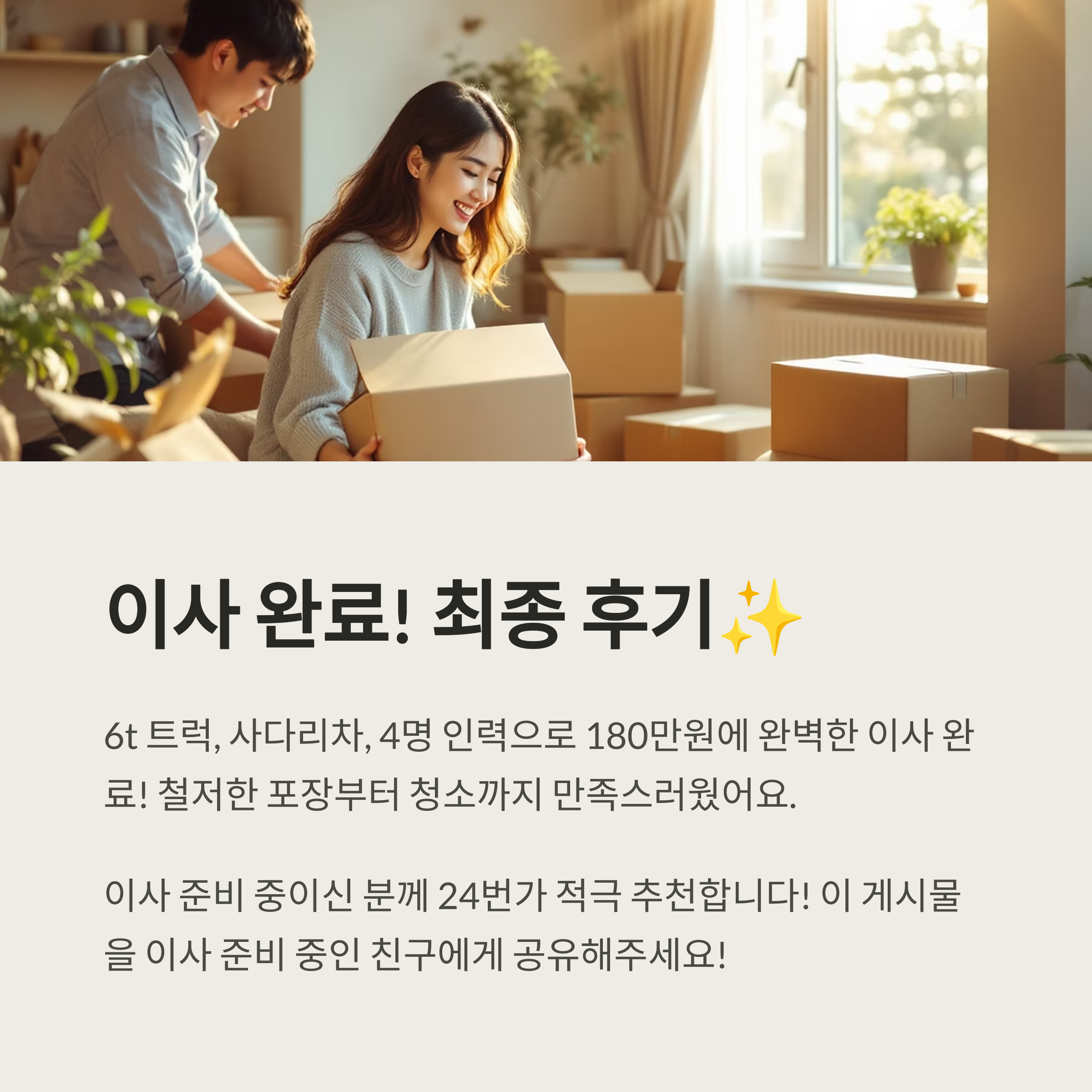 이사 준비부터 정착까지 모든 과정이 수월했고, 합리적인 비용으로 행복한 새 시작을 맞이했답니다. 이사를 앞두고 있다면 24번가 이사를 꼭 활용해보세요! 🚚