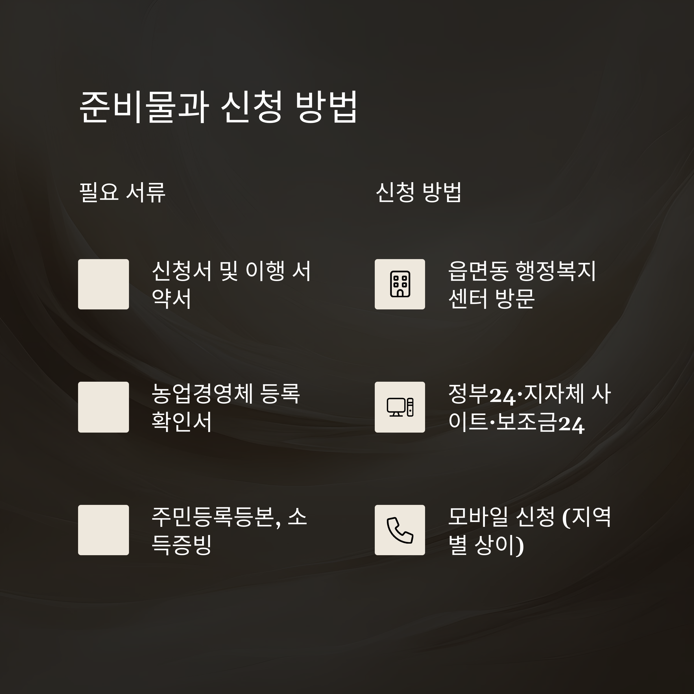 방문 신청: 주소지 읍·면·동 행정복지센터를 방문해 구비서류를 제출합니다. 제주에서는 재배 사실 확인서, 농민수당 수령자 서약서 등이 필요합니다.