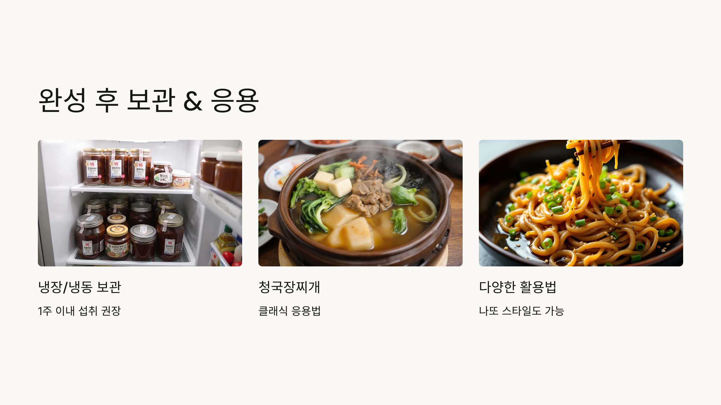 5. 보관: 완성된 청국장은 소분해 냉장 보관(0~5°C)하거나 냉동 보관(-18°C)하세요. 1~2주 내 먹는 것이 가장 맛있어요.