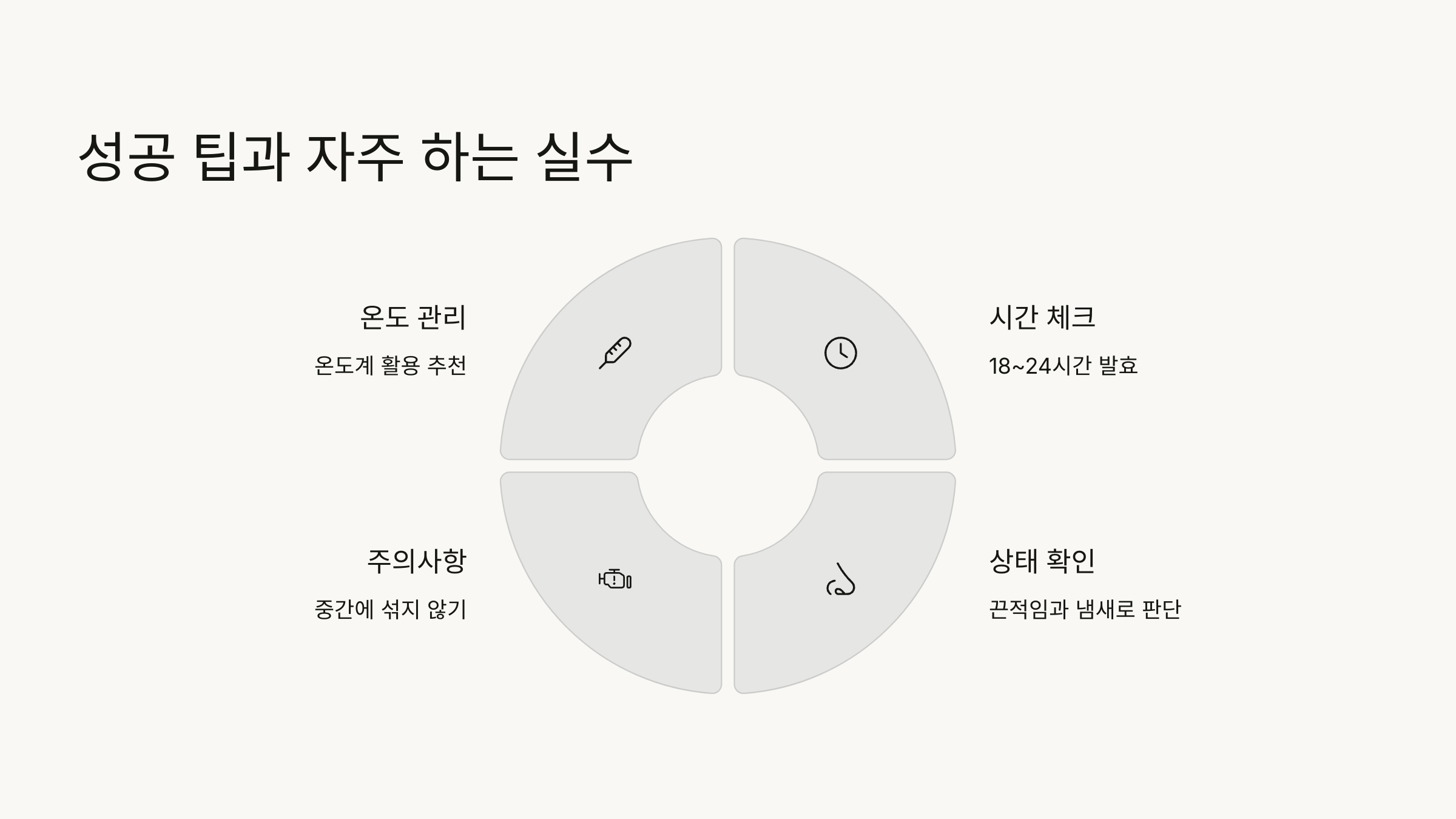 | 온도 유지 | 40~45°C를 유지해 발효를 촉진하세요. |
